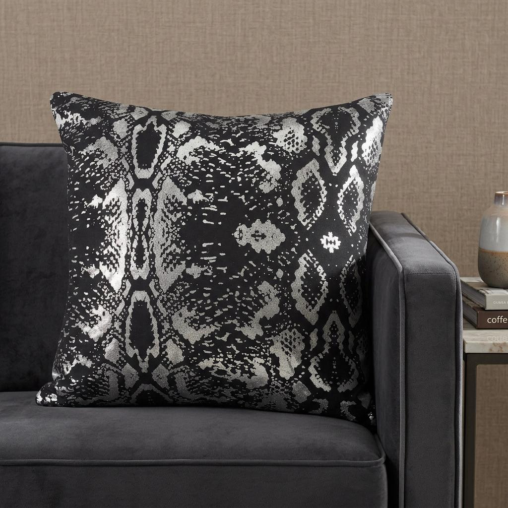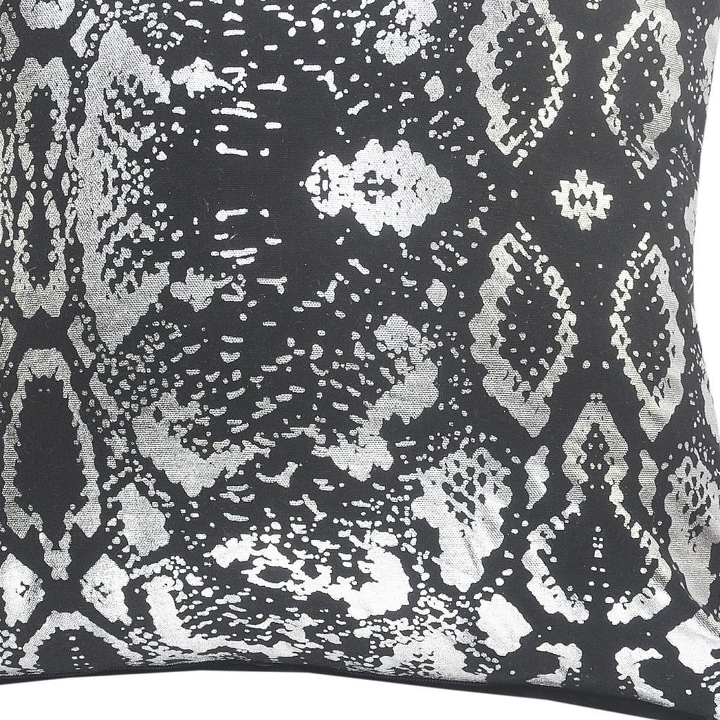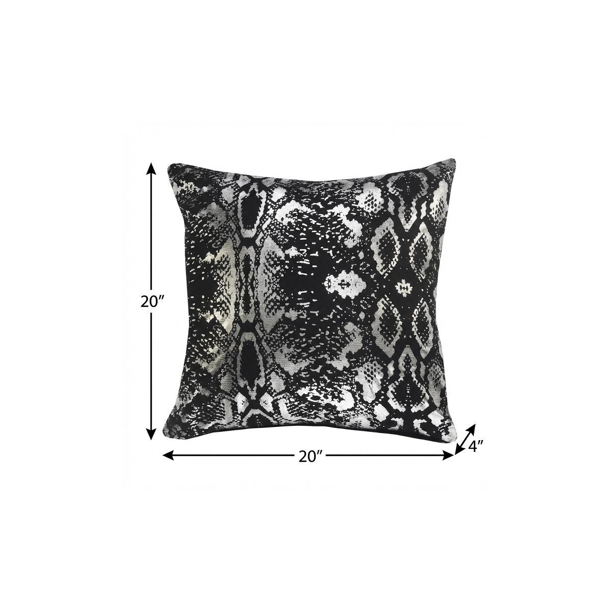 Unique and decorative, this comfortable 20" x 20" black and silver 100% cotton animal print zippered pillow will leave a lasting impression. Soft and textural black and silver 100% cotton has been used to make this pillow look and feel like a real treasure. For anyone that loves to decorate or accent their space with color and texture. A great decorative accessory for your favorite chair, to accent your sofa, or to use as part of your bed ensemble. 4" H x 20" W x 20" D