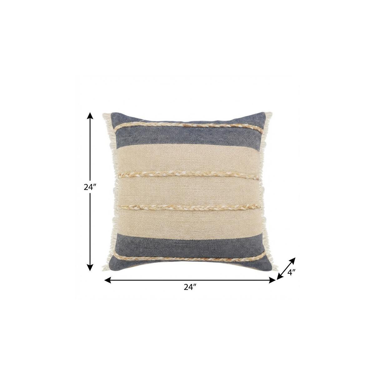 Unique and decorative, this comfortable 24-inch denim blue and taupe jute coastal throw pillow with fringe will leave a lasting impression. The denim blue and taupe coloring of the extremely durable and long lasting jute will add dimension and texture to your space. Super soft and built to hold its shape, this polyfill-filled pillow is a great option. For anyone that loves to decorate or accent their space with color and texture. Decorative throw pillows not only add color and dimension to your space but can be comfy and supportive when you are lounging and cuddling as well. 24-inch h x 24-inch w x 4-inch d.