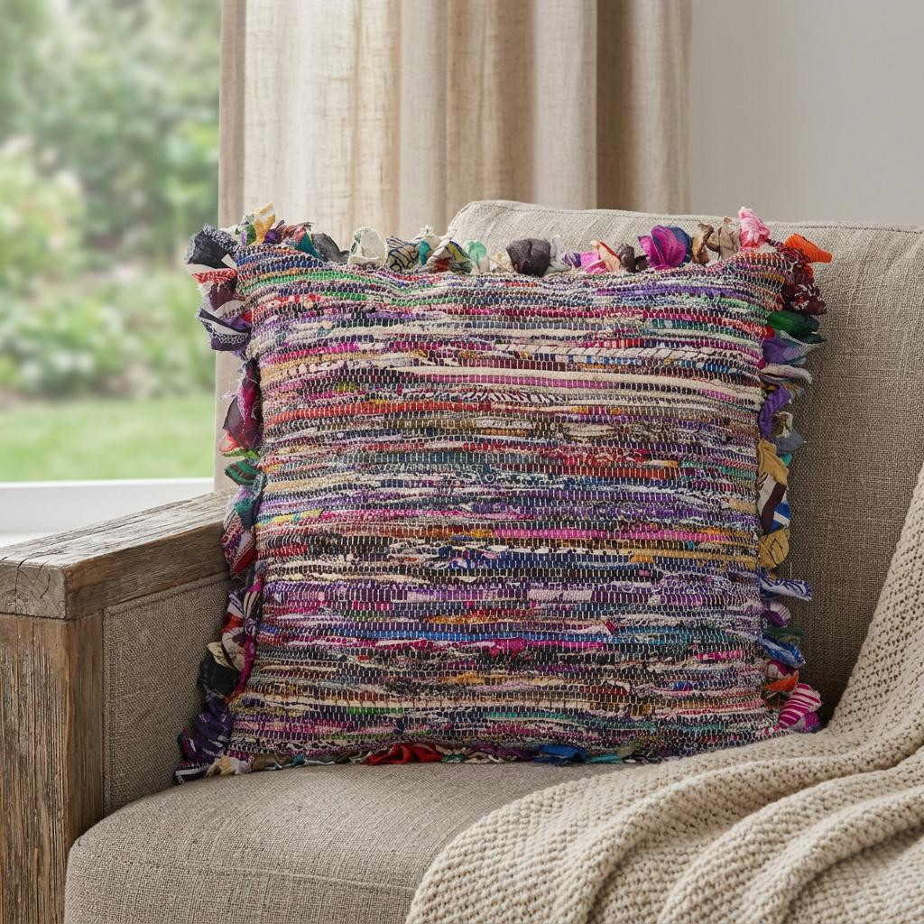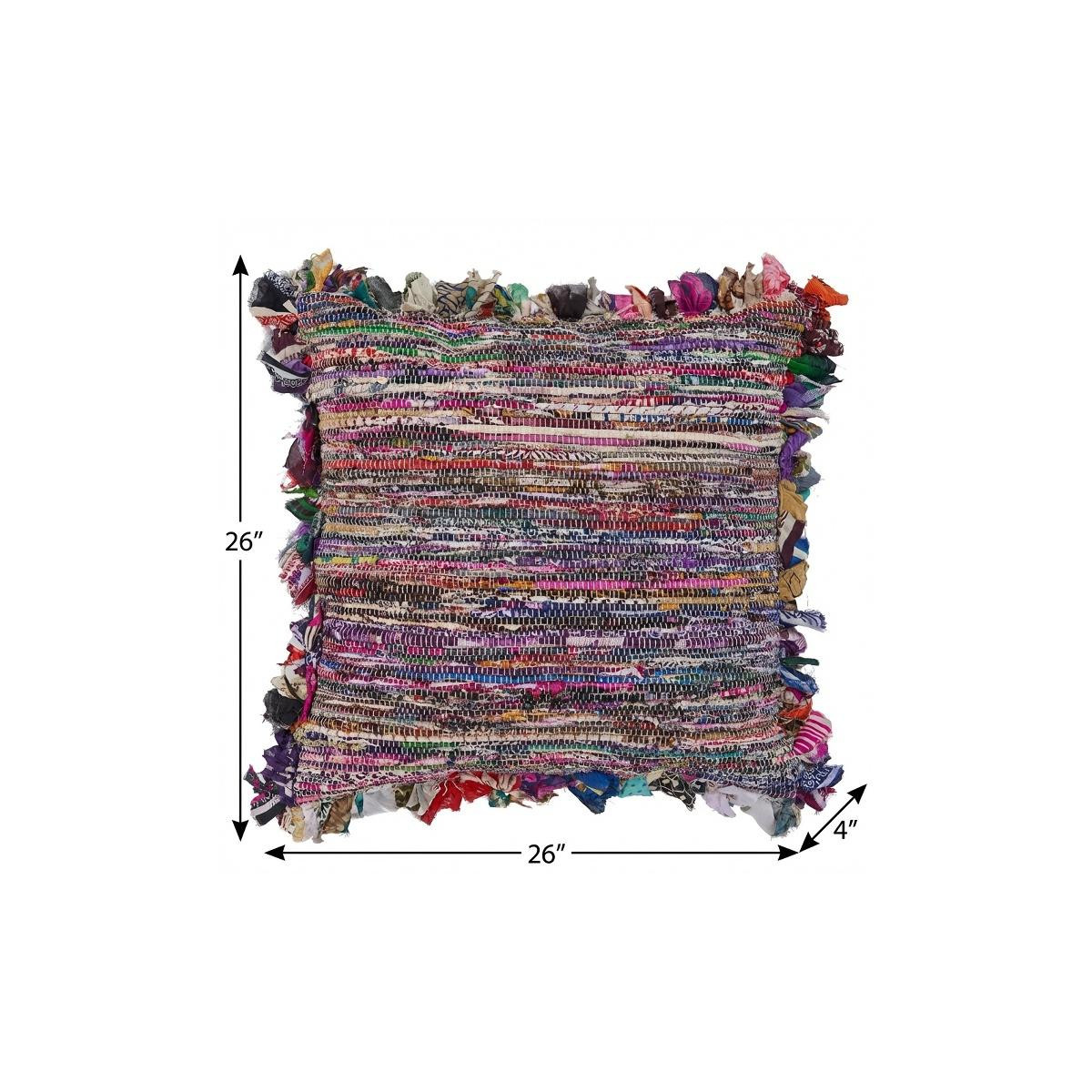 Unique and decorative, this comfortable 26-inch blue and red throw pillow with fringe will leave a lasting impression. This soft and durable decorative pillow is expertly made of high grade, long lasting cotton in a blue and red coloration. This soft polyfill filled pillow not only is decorative but made to be comfy and cozy all day long. Decorative pillows are a great way to change up the look and feel of your space easily and quickly. Decorative throw pillows not only add color and dimension to your space but can be comfy and supportive when you are lounging and cuddling as well. 26-inch h x 26-inch w x 4-inch d.