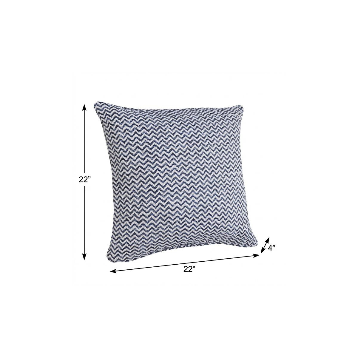 The perfect complement to your sofa, favorite chair, or bed, this 22" x 22" navy blue and white 100% cotton chevron zippered pillow is a great decorative accent. The navy blue and white coloring of the soft and long lasting 100% cotton will add dimension and texture to your space. Great to use on its own or mix with other decorations for the perfect look. A great decorative accessory for your favorite chair, to accent your sofa, or to use as part of your bed ensemble. 4" H x 22" W x 22" D
