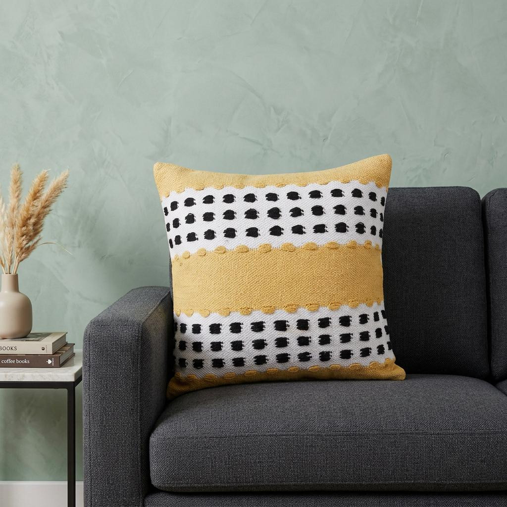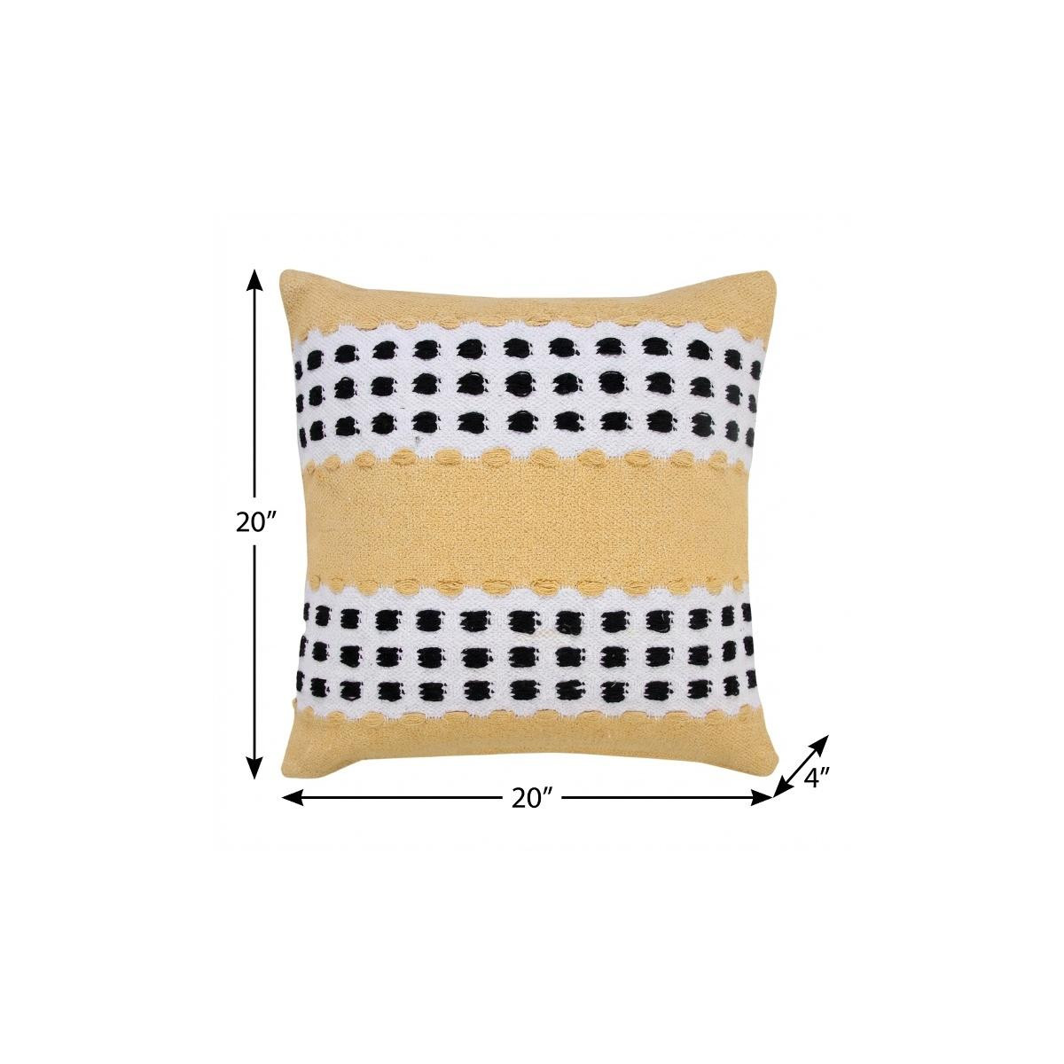 The 20" x 20" yellow black and white 100% cotton striped zippered pillow is the perfect decorative accessory for your home. Soft and textural yellow black and white 100% cotton has been used to make this pillow look and feel like a real treasure. Great to use on its own or mix with other decorations for the perfect look. A great decorative accessory for your favorite chair, to accent your sofa, or to use as part of your bed ensemble. 4" H x 20" W x 20" D