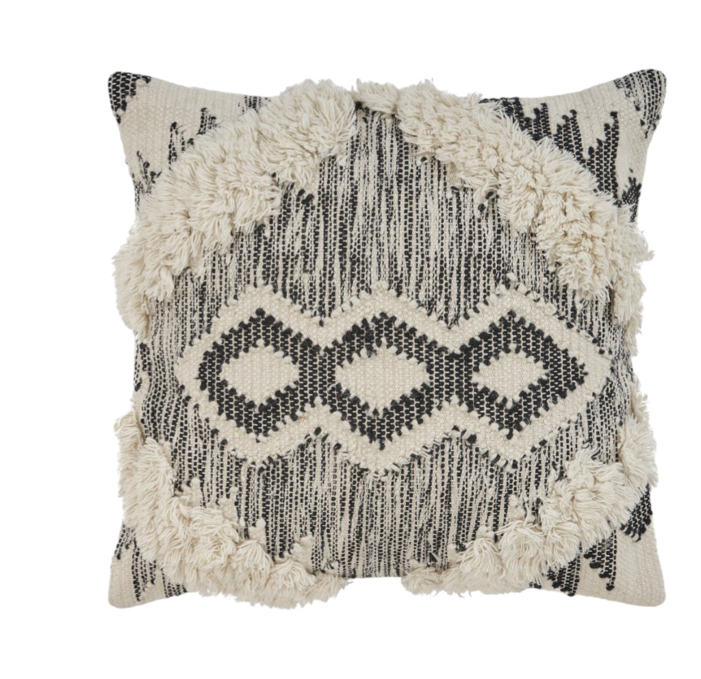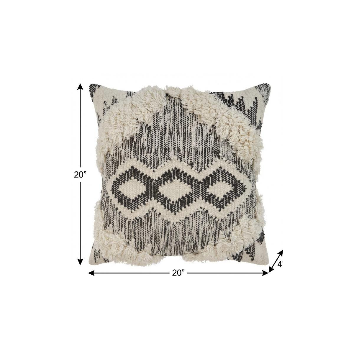 Bring a bit of fashion and zip to your space with this eye-catching and comfy 20-inch black and ivory throw pillow. This black and ivory colored decorative pillow is made from high grade cotton blend that is durable and long lasting. Super soft and built to hold its shape, this polyfill-filled pillow is a great option. Decorative pillows are a great way to change up the look and feel of your space easily and quickly. Decorative throw pillows not only add color and dimension to your space but can be comfy and supportive when you are lounging and cuddling as well. 20-inch h x 20-inch w x 4-inch d.