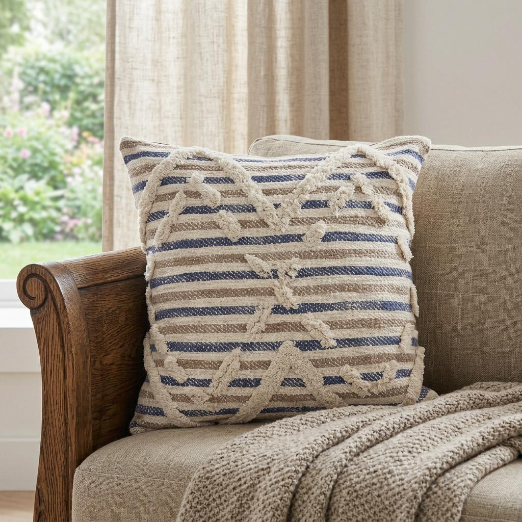 beige cotton striped throw pillow, cotton striped throw pillow, striped throw pillow, blue beige cotton striped throw, 18" blue beige cotton striped |