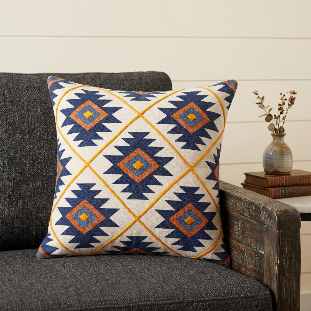 This 20" x 20" blue 100% cotton geometric zippered pillow will add a beautiful decorative accent to your decor. The blue coloring of the soft and long lasting 100% cotton will add dimension and texture to your space. For anyone that loves to decorate or accent their space with color and texture. Decorative pillows are a great way to change up the look and feel of your space easily and quickly. 4" H x 20" W x 20" D