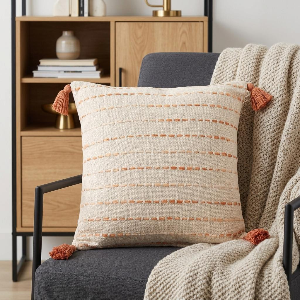 Add an air of fashion to your room and rejuvenate the space with this cute and fashionable 20" x 20" coral and ivory 100% cotton striped zippered pillow. The coral and ivory coloring of the soft and long lasting 100% cotton will add dimension and texture to your space. Decorative throw pillows not only add color and dimension to your space but can be comfy and supportive when you are lounging and cuddling as well. Decorative pillows are a great way to change up the look and feel of your space easily and quickly. 4" H x 20" W x 20" D