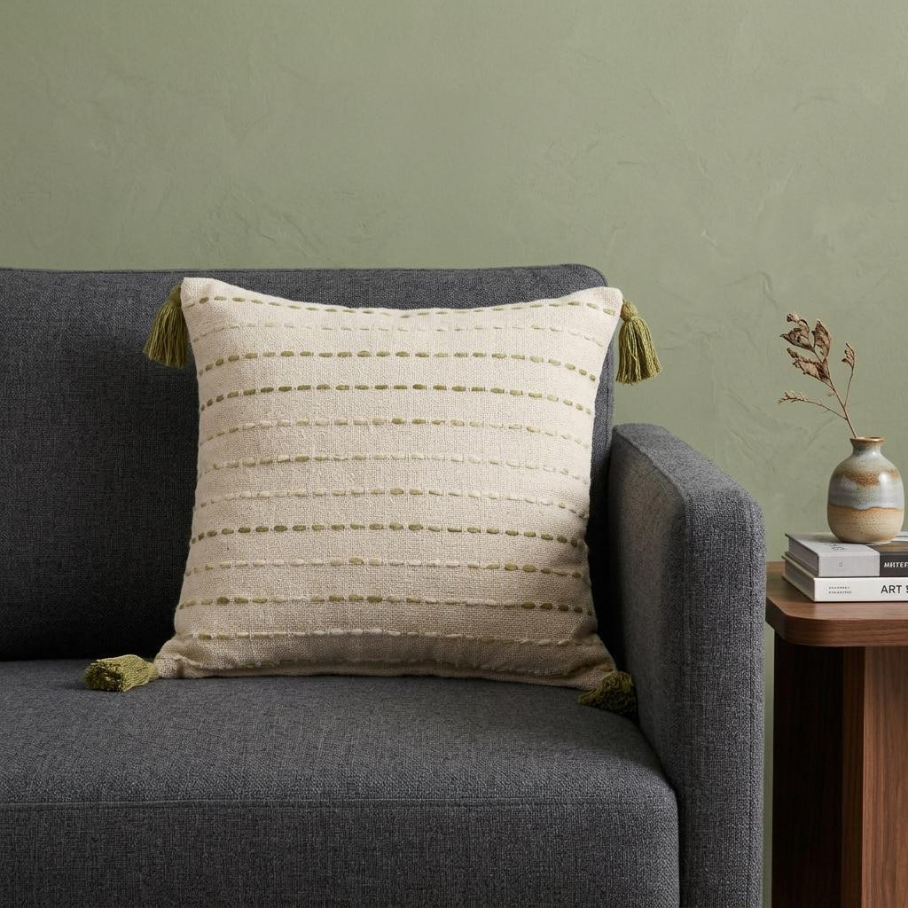 Add an air of fashion to your room and rejuvenate the space with this cute and fashionable 20-inch olive green and ivory cotton striped throw pillow with tassels. This olive green and ivory colored decorative pillow is made from high grade cotton that is durable and long lasting. Charming decorative tassels give this design texture along with a hand-crafted look and feel. Super soft and built to hold its shape, this polyfill-filled pillow is a great option. Great to use on its own or mix with other decorations for the perfect look. Decorative throw pillows not only add color and dimension to your space but can be comfy and supportive when you are lounging and cuddling as well. 20-inch h x 20-inch w x 4-inch d.