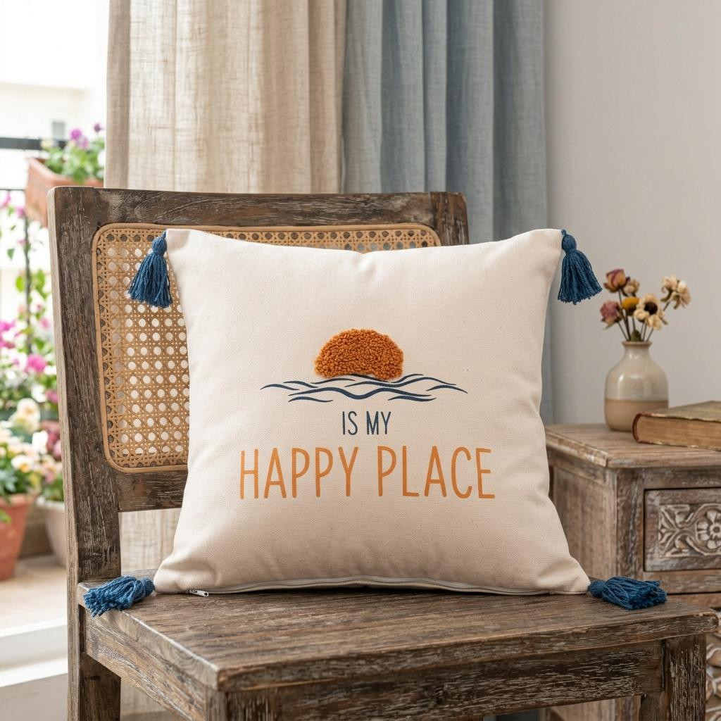 Add an air of fashion to your room and rejuvenate the space with this cute and fashionable 20-inch white navy blue and yellow fabric the sea is my happy place text throw pillow with tassels. This white, navy blue, and yellow hued piece represents quality construction, expertly made from durable polyester that is not only long lasting but soft to the touch as well. Fun and decorative tassels add some high end and hand-crafted textural designer touches. This soft polyfill filled pillow not only is decorative but made to be comfy and cozy all day long. Decorative pillows are a great way to change up the look and feel of your space easily and quickly. A great decorative accessory to add color and dimension to your favorite chair, accent your sofa, or to use as part of your bed ensemble. 20-inch h x 20-inch w x 4-inch d.