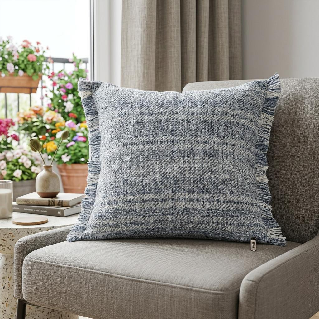 Bring a bit of fashion and zip to your space with this eye-catching and comfy 20-inch denim blue and ivory fabric striped throw pillow. This denim blue and ivory hued piece represents quality construction, expertly made from durable polyester that is not only long lasting but soft to the touch as well. Super soft and built to hold its shape, this polyfill-filled pillow is a great option. For anyone that loves to decorate or accent their space with color and texture. A great decorative accessory to add color and dimension to your favorite chair, accent your sofa, or to use as part of your bed ensemble. 20-inch h x 20-inch w x 4-inch d.