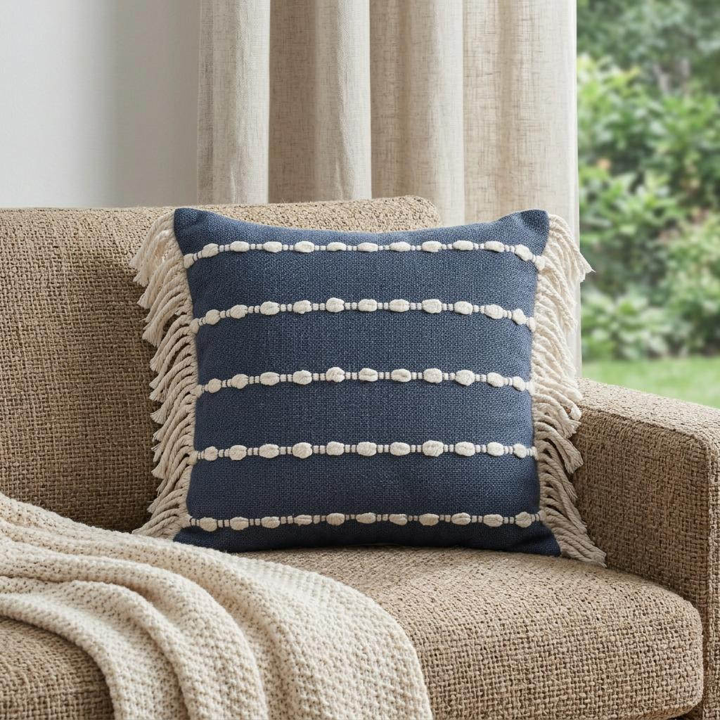 The perfect complement to your sofa, favorite chair, or bed, this 20-inch navy blue and ivory cotton striped throw pillow with fringe is a great decorative accent. This soft and durable decorative pillow is expertly made of high grade, long lasting cotton in a navy blue and ivory coloration. This soft polyfill filled pillow not only is decorative but made to be comfy and cozy all day long. Decorative pillows are a great way to change up the look and feel of your space easily and quickly. Decorative throw pillows not only add color and dimension to your space but can be comfy and supportive when you are lounging and cuddling as well. 20-inch h x 20-inch w x 4-inch d.