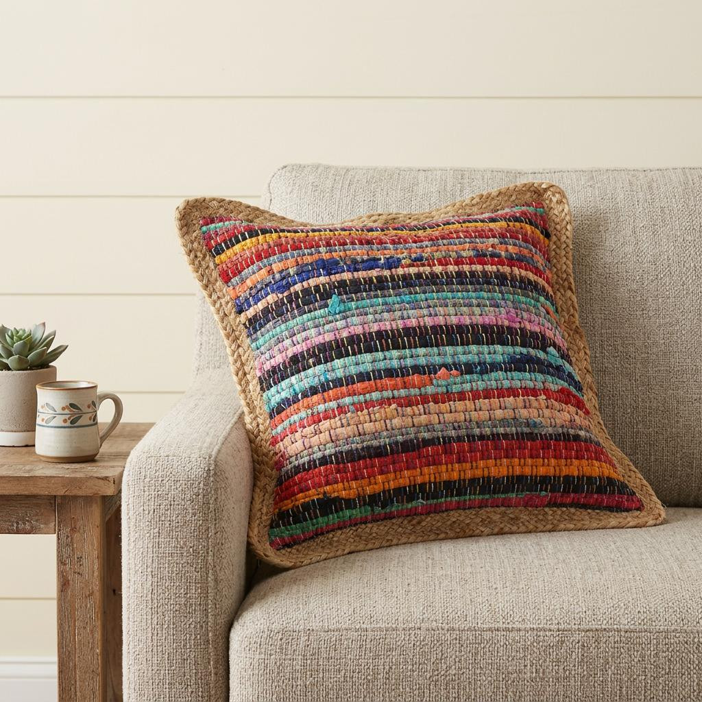 Unique and decorative, this comfortable 20-inch tan orange and blue striped cotton and jute throw pillow will leave a lasting impression. This soft and durable decorative pillow is expertly made of high grade, long lasting chindi style cotton and jute in a rainbow of multi colors. Super soft and built to hold its shape, this polyfilled pillow is a great option for anyone that loves to decorate or accent their space with color and texture. 20-inch H x 20-inch W x 4-inch D