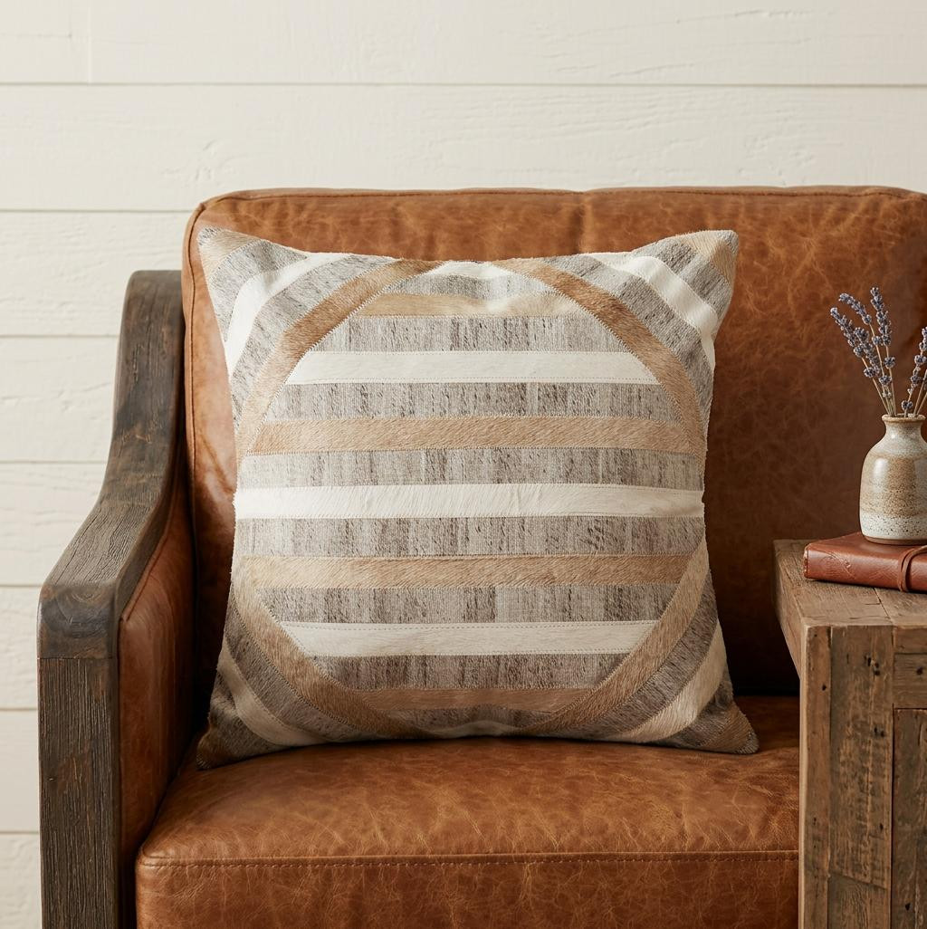 Unique and decorative, this comfortable 20-inch beige and brown striped cowhide throw pillow will leave a lasting impression. Indulge in a bit of luxury with this beige and brown colored decorative pillow covered with high grade, genuine cowhide. Elegantly chic, this pillow is the epitome of luxury. Super soft and built to hold its shape, this polyfill pillow is a great option. Decorative throw pillows not only add color and dimension to your space but can be comfy and supportive when you are lounging and cuddling as well. A great decorative accessory for your favorite chair, to accent your sofa, or to use as part of your bed ensemble. 20-inch H x 20-inch W x 4-inch D