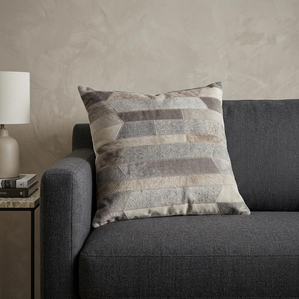 Bring a bit of fashion and zip to your space with this eye-catching and comfy 20-inch beige gray and ivory striped wool and faux hide throw pillow. The beige, gray, and ivory coloring of the extremely durable and long lasting wool and faux hide will add dimension and texture to your space. Super soft and built to hold its shape, this polyfill pillow is a great option. Great to use on its own or mix with other decorations for the perfect look. A great decorative accessory to add color and dimension to your favorite chair, accent your sofa, or to use as part of your bed ensemble. 20-inch h x 20-inch w x 4-inch d