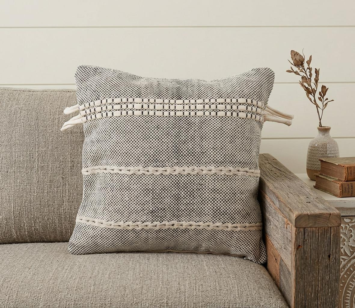 This 20-inch black and natural striped cotton throw pillow with tassels will add a beautiful decorative accent to your decor. Durable black and natural cotton has been used to give this pillow a beautiful look that will stand the test of time. Charming decorative tassels and stitching give this design texture along with a hand-crafted boho chic style. This soft polyfill filled pillow not only is decorative but made to be comfy and cozy all day long. A great decorative accessory to add color and dimension to your favorite chair, accent your sofa, or to use as part of your bed ensemble. 20-inch h x 20-inch w x 4-inch d.