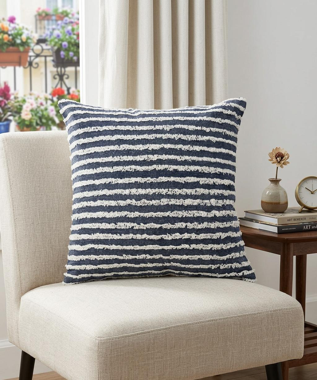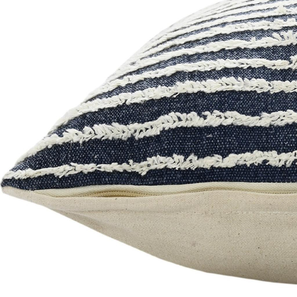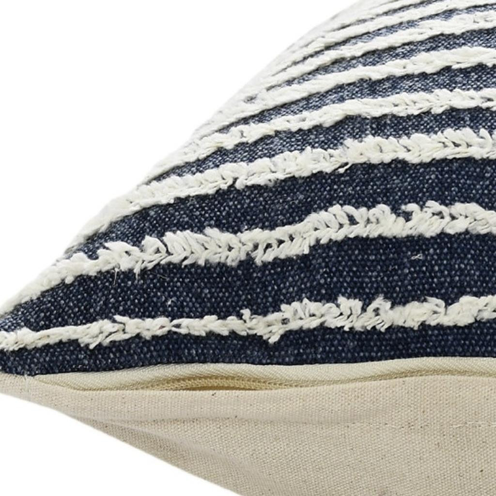 This 20" x 20" ensign blue and cream 100% cotton striped zippered pillow will add a beautiful decorative accent to your decor. This super soft decorative pillow is expertly made of high grade, long lasting 100% cotton in a ensign blue and cream coloration. Decorative throw pillows not only add color and dimension to your space but can be comfy and supportive when you are lounging and cuddling as well. A great decorative accessory for your favorite chair, to accent your sofa, or to use as part of your bed ensemble. 4" H x 20" W x 20" D