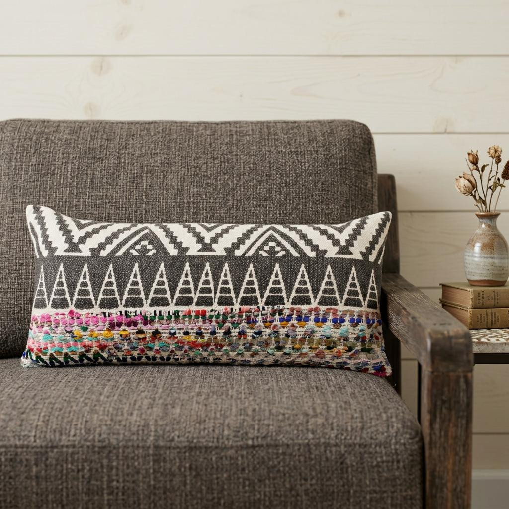 The perfect complement to your sofa, favorite chair, or bed, this 14" x 36" off-white black red blue orange and green 100% cotton geometric zippered pillow is a great decorative accent. Soft and textural off-white black red blue orange and green 100% cotton has been used to make this pillow look and feel like a real treasure. Great to use on its own or mix with other decorations for the perfect look. A great decorative accessory for your favorite chair, to accent your sofa, or to use as part of your bed ensemble. 14" H x 14" W x 36" D