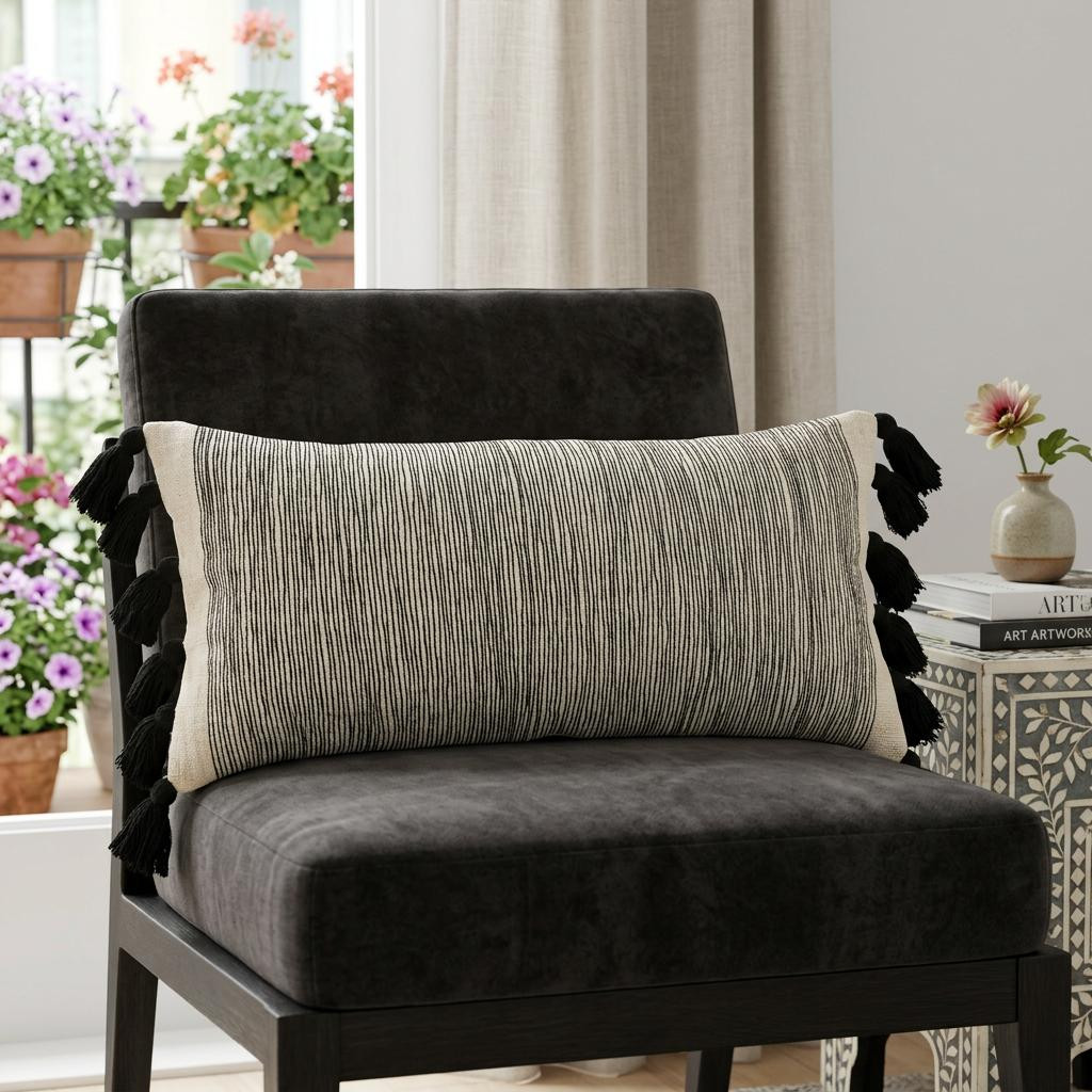 Unique and decorative, this comfortable 12-inch x 28-inch gray ivory and black cotton wavy stripe throw pillow with fringe will leave a lasting impression. This gray, ivory, and black hued piece represents quality construction, expertly made from durable cotton that is not only long lasting but soft to the touch as well. Super soft and built to hold its shape, this polyfill-filled pillow is a great option. Decorative pillows are a great way to change up the look and feel of your space easily and quickly. Decorative throw pillows not only add color and dimension to your space but can be comfy and supportive when you are lounging and cuddling as well. 12-inch h x 28-inch w x 7.5-inch d.