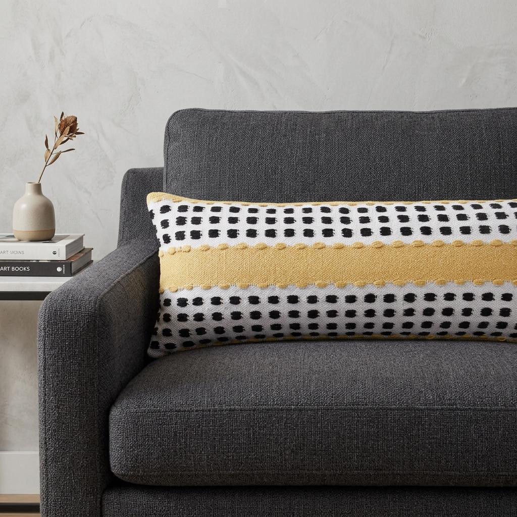 The perfect complement to your sofa, favorite chair, or bed, this 14-inch x 36-inch yellow black and white cotton striped throw pillow is a great decorative accent. The yellow, black, and white coloring of the extremely durable and long lasting cotton will add dimension and texture to your space. Super soft and built to hold its shape, this polyfill-filled pillow is a great option. For anyone that loves to decorate or accent their space with color and texture. A great decorative accessory to add color and dimension to your favorite chair, accent your sofa, or to use as part of your bed ensemble. 14-inch h x 36-inch w x 7.5-inch d.