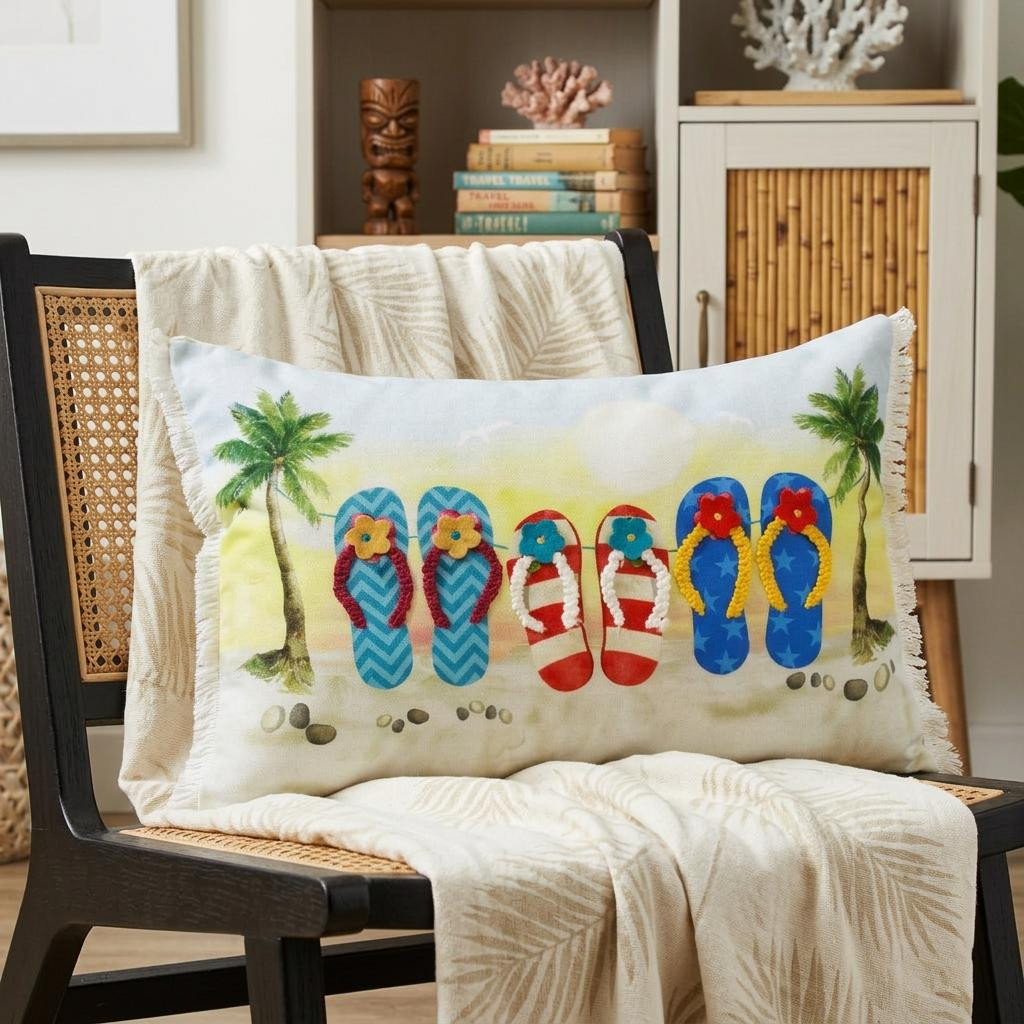 Add an air of fashion to your room and rejuvenate the space with this cute and fashionable 14-inch x 20-inch green blue and ivory flip flops lumbar throw pillow with fringe. This green and off white hued piece represents quality construction, expertly made from durable polyester that is not only long lasting but soft to the touch as well. Super soft and built to hold its shape, this polyfill-filled pillow is a great option. Decorative pillows are a great way to change up the look and feel of your space easily and quickly. Decorative throw pillows not only add color and dimension to your space but can be comfy and supportive when you are lounging and cuddling as well. 14.00-inch h x 20.00-inch w x 4.00-inch d.