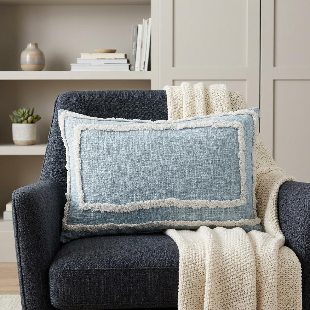 The 16-inch x 24-inch sky blue and white cotton geometric throw pillow is the perfect decorative accessory for your home. This sky blue and white hued piece represents quality construction, expertly made from durable cotton that is not only long lasting but soft to the touch as well. Super soft and built to hold its shape, this polyfill-filled pillow is a great option. Decorative pillows are a great way to change up the look and feel of your space easily and quickly. A great decorative accessory to add color and dimension to your favorite chair, accent your sofa, or to use as part of your bed ensemble. 16-inch h x 24-inch w x 7.5-inch d.