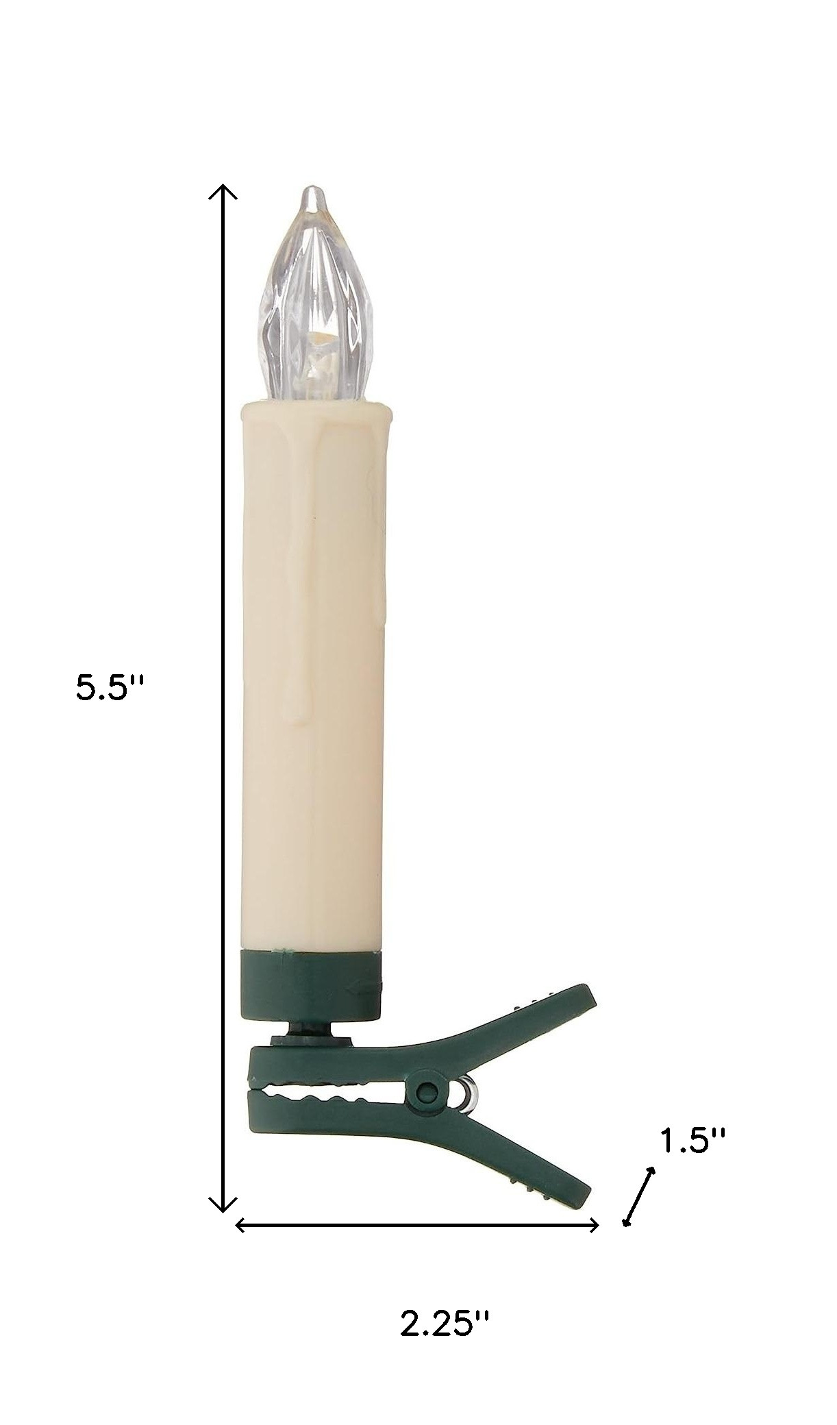 Decorate for the holiday in festive style with this Set of Twelve White Flameless Christmas Clip On Taper Candles. These LED clip-on candles have the texture and look of a real candle without the safety concerns of a real open flame. These beautiful candles will add some vintage style to your tree. They are easy to operate with the included remote control and multi hour timer function. 5.5-inch H x 1.5-inch W x 2.25-inch D