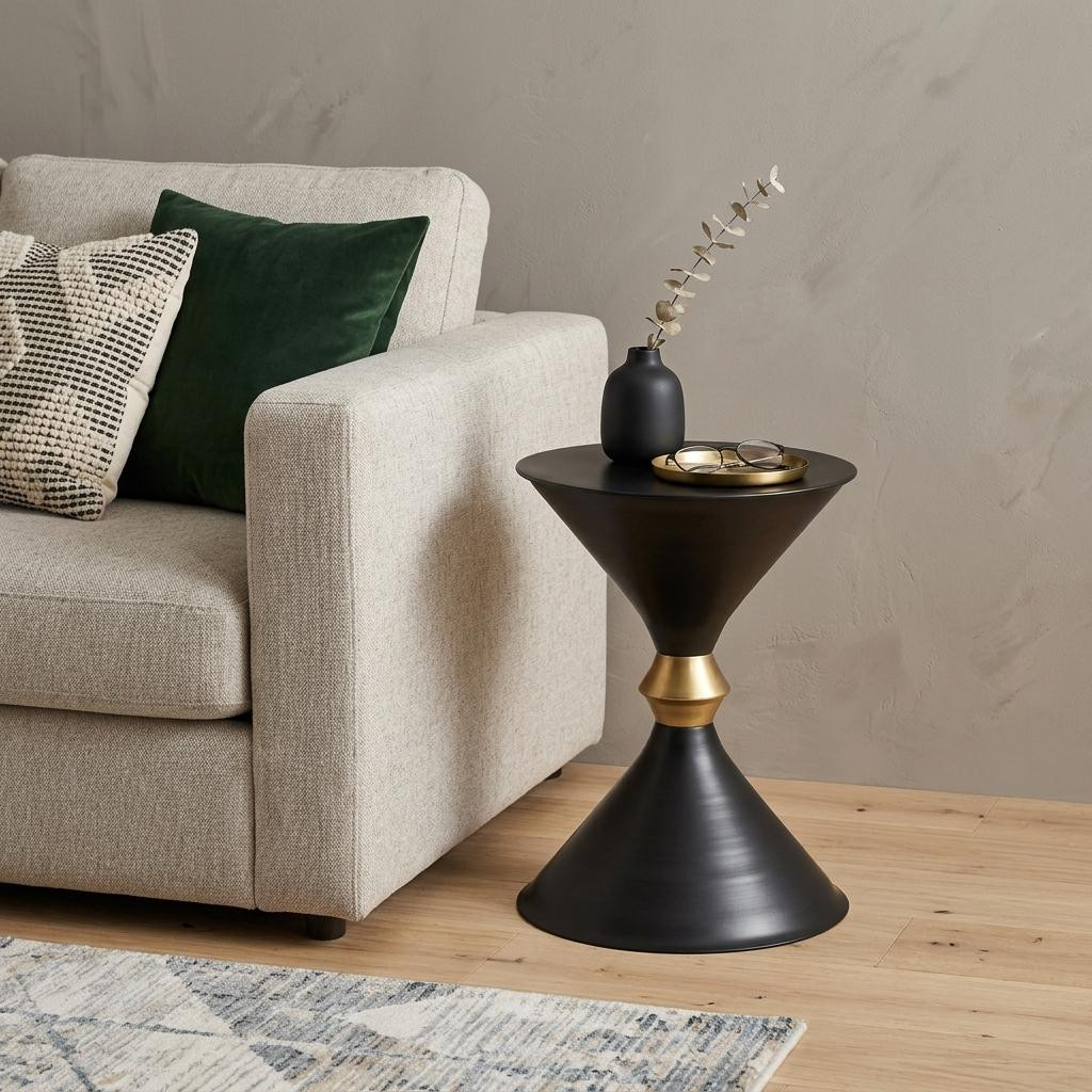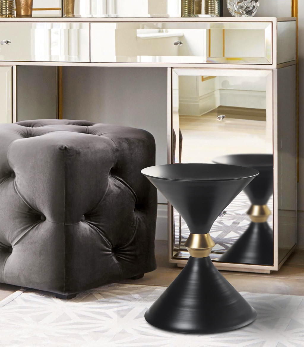 Distinctive in style the 18-inch black iron end table radiates a versatile charm. This table is made from iron in a black color throughout the base and top. An ideal location for placing your snacks and drinks, and a place to keep your lamp, frames, or other accessories. You can also use it as an entryway table to hold your keys. 18-inch H x 14-inch W x 14-inch D