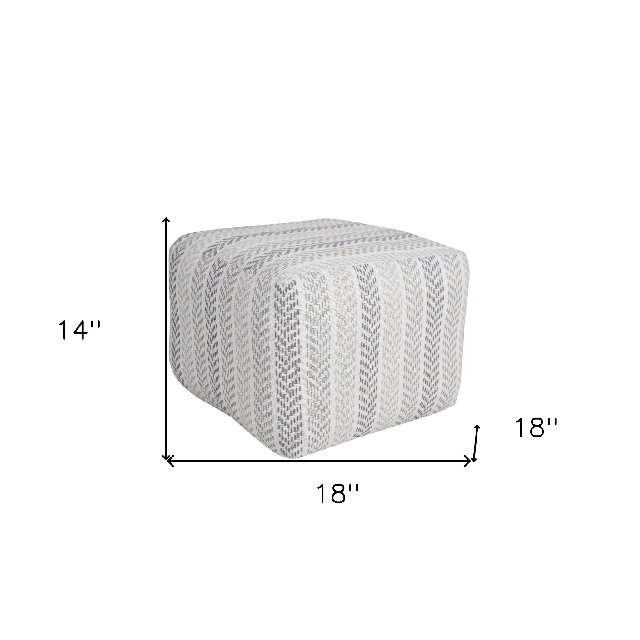 Get ready to relax with this 18-inch gray and white cotton chevron pouf ottoman. Add chic style to your space with this fun pouf that not only looks cool but can be a great foot rest or extra seat when needed. Expertly upholstered with padding and soft cotton in a chevron pattern, this ottoman is as comfortable as it is good looking. Easy to blend into most any room, a ottoman is a way to add a good looking accent to your space that can also be practical and useful. 14-inch h x 18-inch w x 18-inch d.