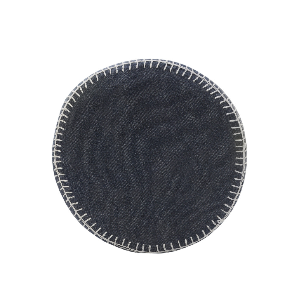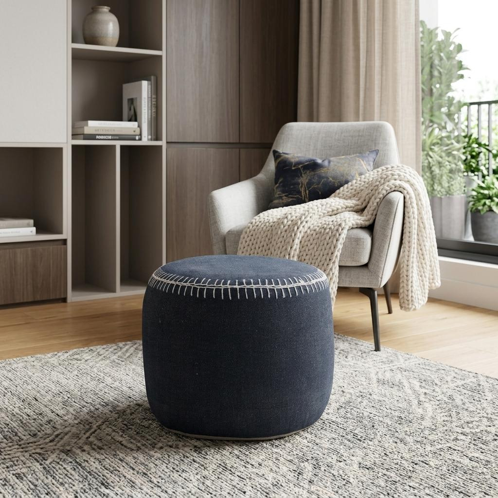 Get ready to relax with this 18-inch blue cotton cylinder striped pouf ottoman. Add chic style to your space with this fun pouf that not only looks cool but can be a great foot rest or extra seat when needed. Expertly upholstered with padding and soft 100% cotton in a striped pattern, this ottoman is as comfortable as it is good looking. Easy to blend into most any room, a ottoman is a way to add a good looking accent to your space that can also be practical and useful. 14-inch h x 18-inch w x 18-inch d.