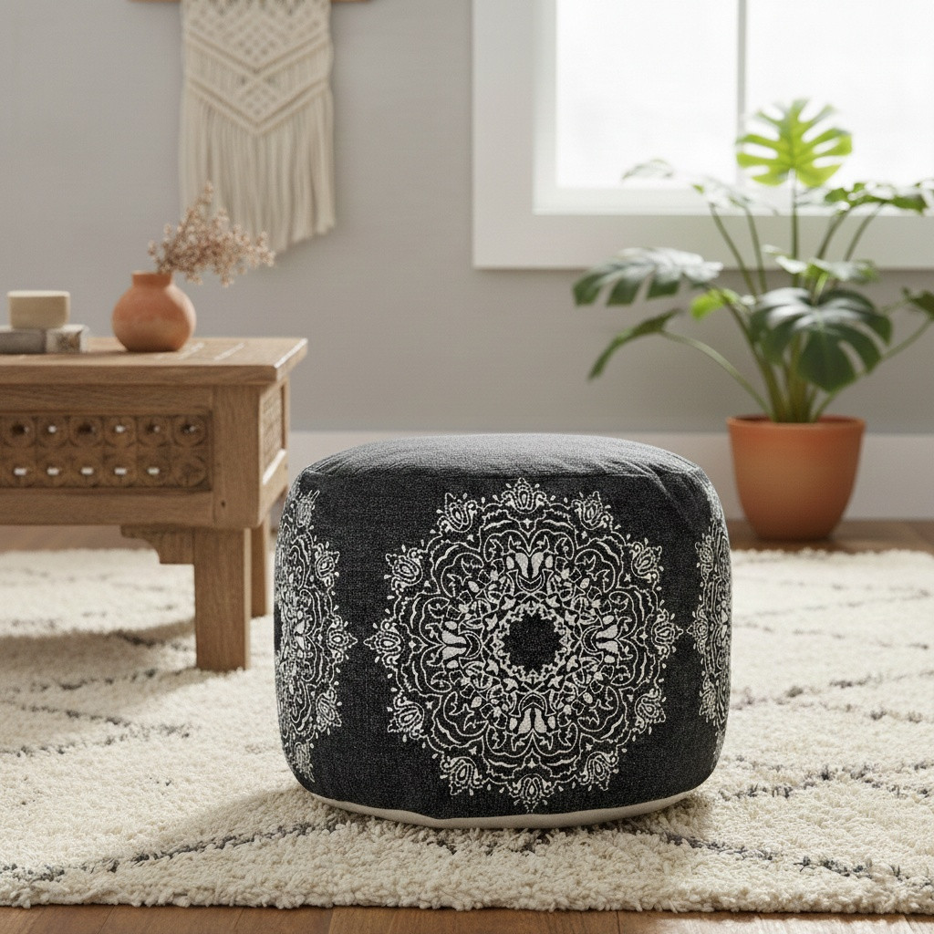 cotton cylinder medallion pouf ottoman, cylinder medallion pouf ottoman, medallion pouf ottoman, 18" black cotton cylinder medallion, black cotton cylinder medallion pouf |
