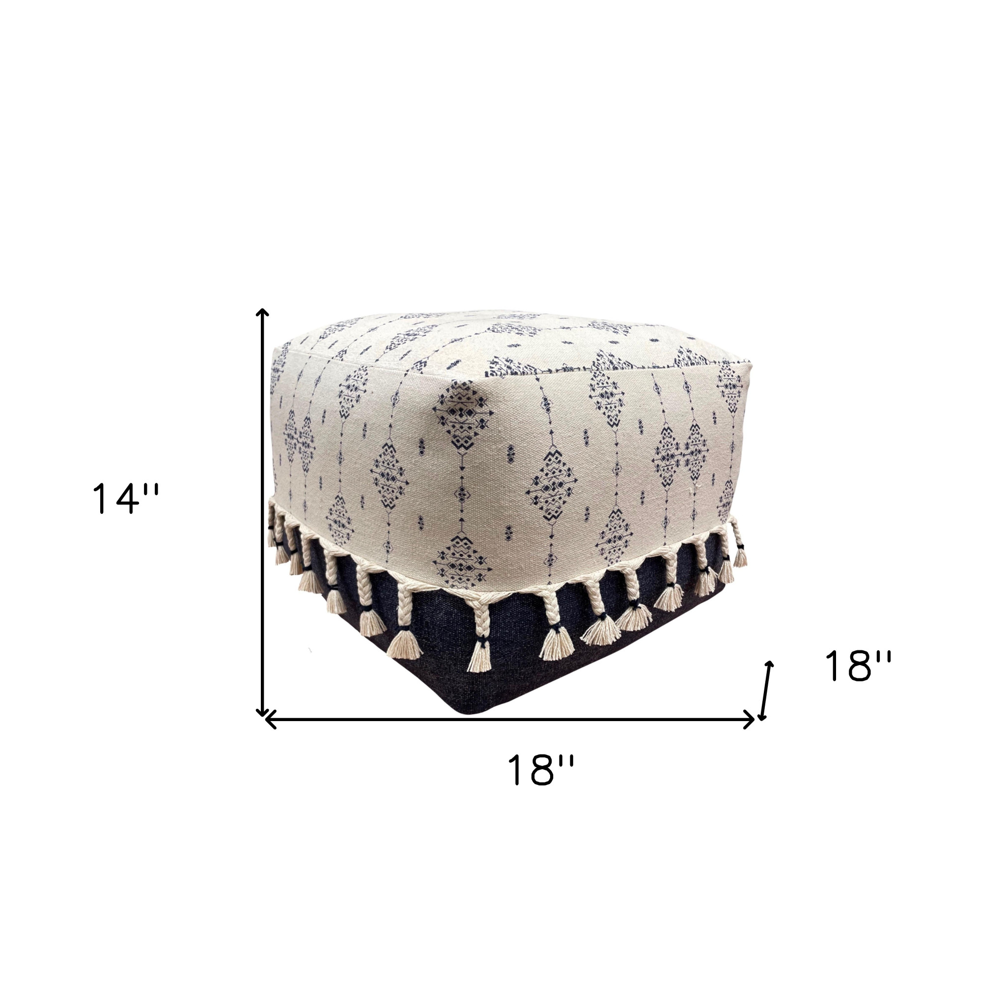 Practicality and fashion mix together with this handy 18-inch natural and navy blue cotton medallion pouf ottoman. Add chic style to your space with this fun pouf that not only looks cool but can be a great foot rest or extra seat when needed. Expertly upholstered with padding and soft cotton in a medallion pattern, this ottoman is as comfortable as it is good looking. Ottomans are multi-functional additions to your space that add fashion and practical value. 14-inch h x 18-inch w x 18-inch d.