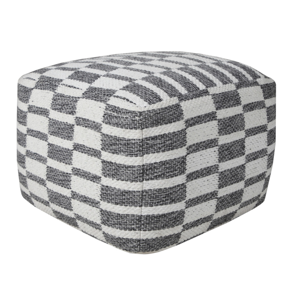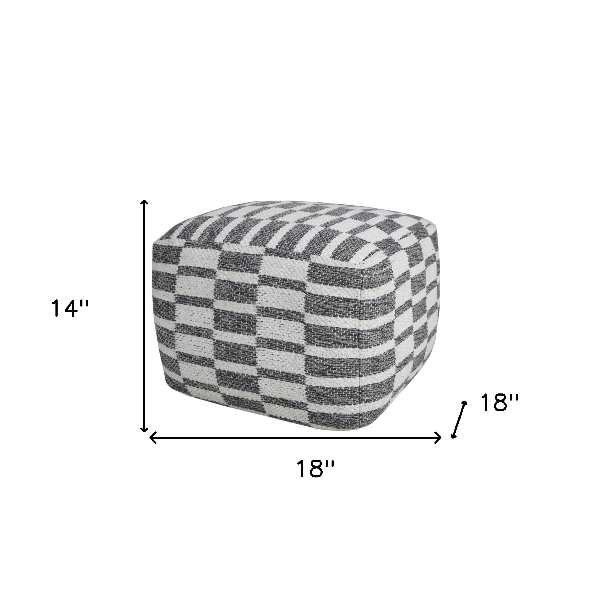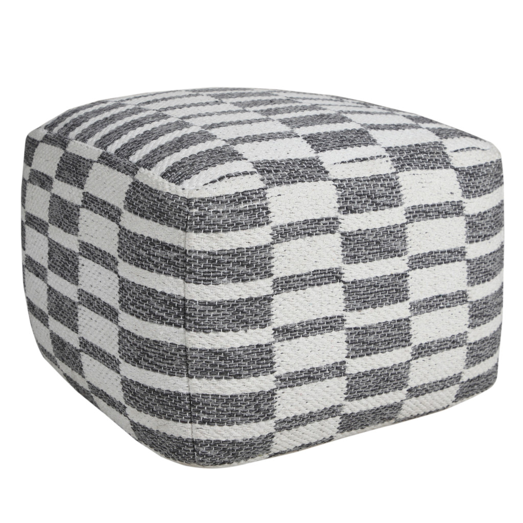 Get ready to relax with this 18-inch gray cotton geometric pouf ottoman. Add chic style to your space with this fun pouf that not only looks cool but can be a great foot rest or extra seat when needed. Expertly upholstered with padding and soft 100% cotton in a geometric pattern, this ottoman is as comfortable as it is good looking. Ottomans are multi-functional additions to your space that add fashion and practical value. 14-inch h x 18-inch w x 18-inch d.