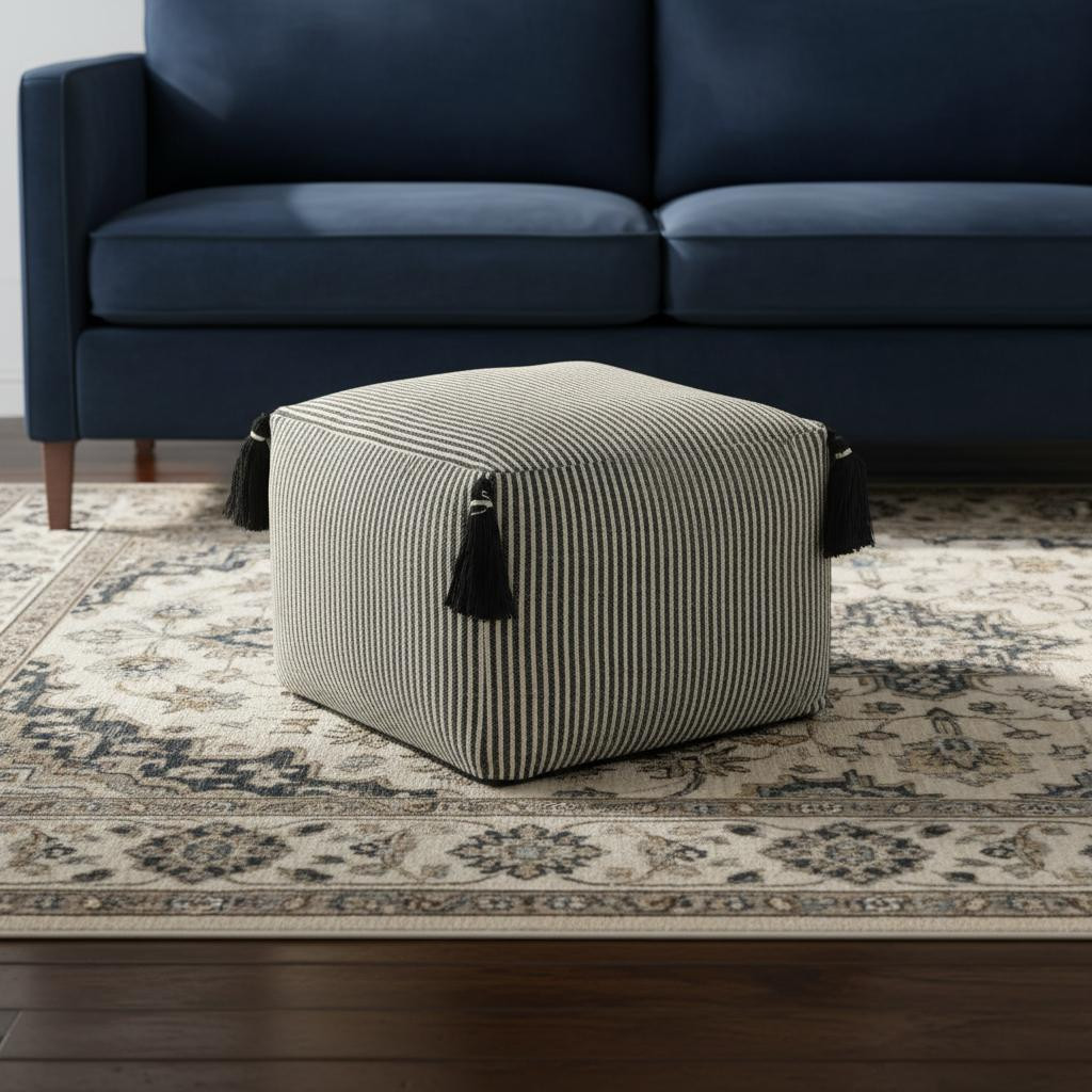 gray cotton striped pouf ottoman, cotton striped pouf ottoman, striped pouf ottoman, 18" gray cotton striped pouf, 18" gray cotton striped |