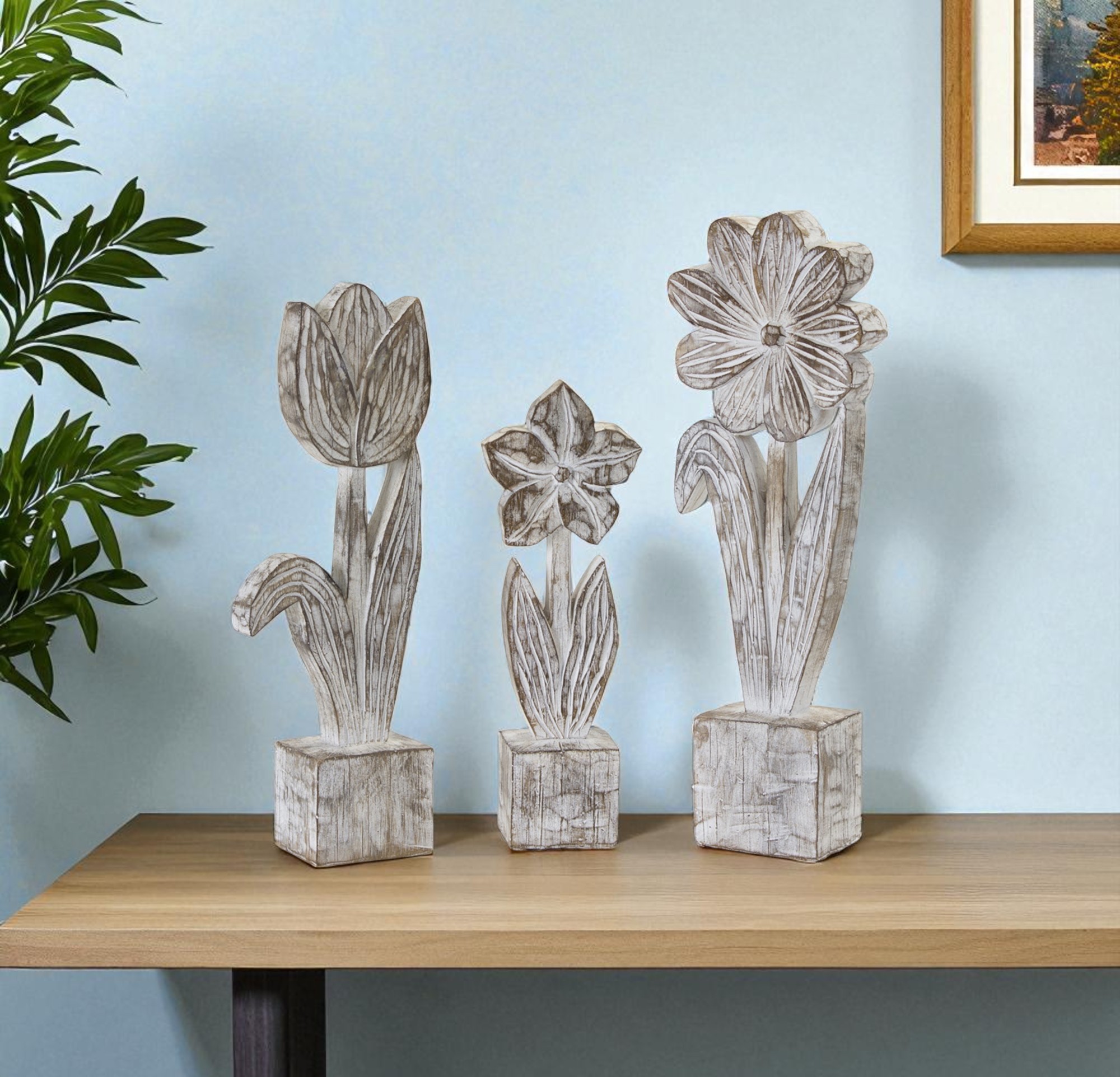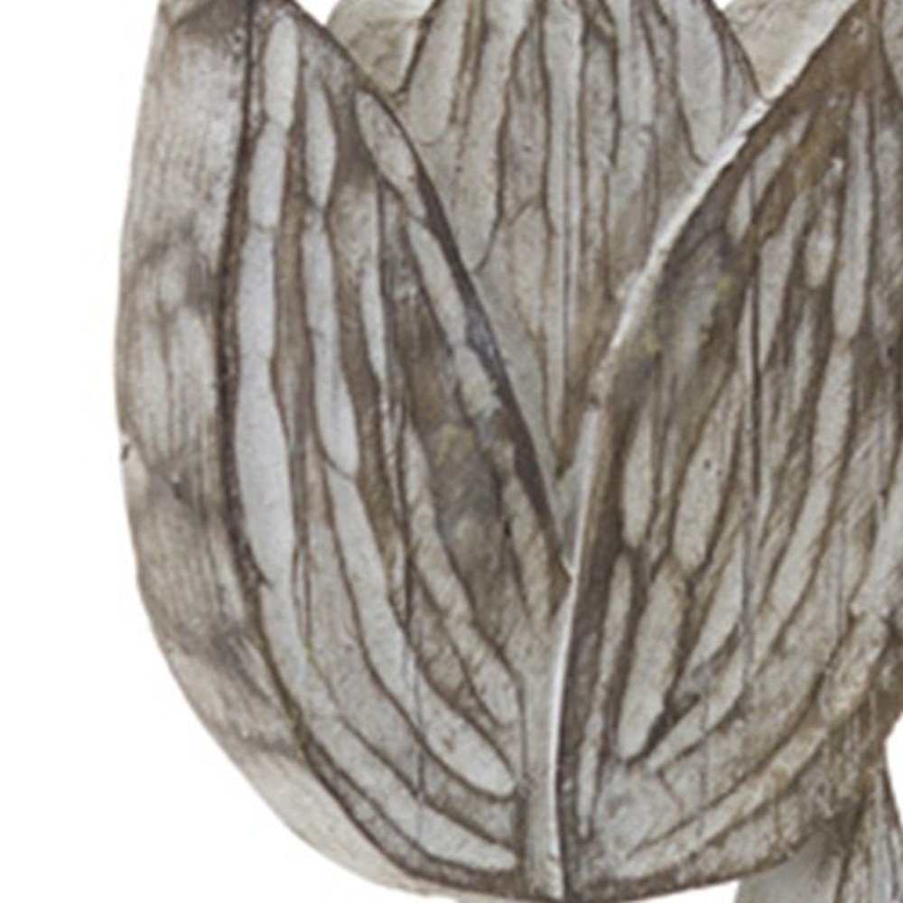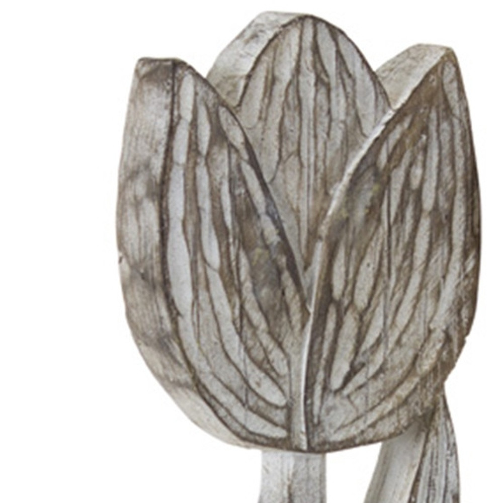 Add an air of fashion to your room and rejuvenate the space with this set of three gray cement and polyresin flowers tabletop sculpture. Crafted with a machine-made process, this eye-catching piece embraces the beauty of nature while showcasing a modern aesthetic. Each sculpture features unique coat and paint distressing, adding an artistic touch to your decor. The set contains three pieces, making it a versatile option for various tabletop arrangements. Made of durable materials, this sculpture set is perfect for enhancing your living environment. 14.25-inch h x 2.25-inch w x 4.00-inch d.