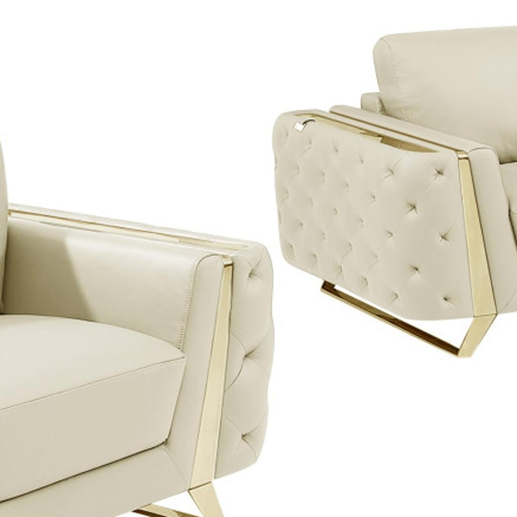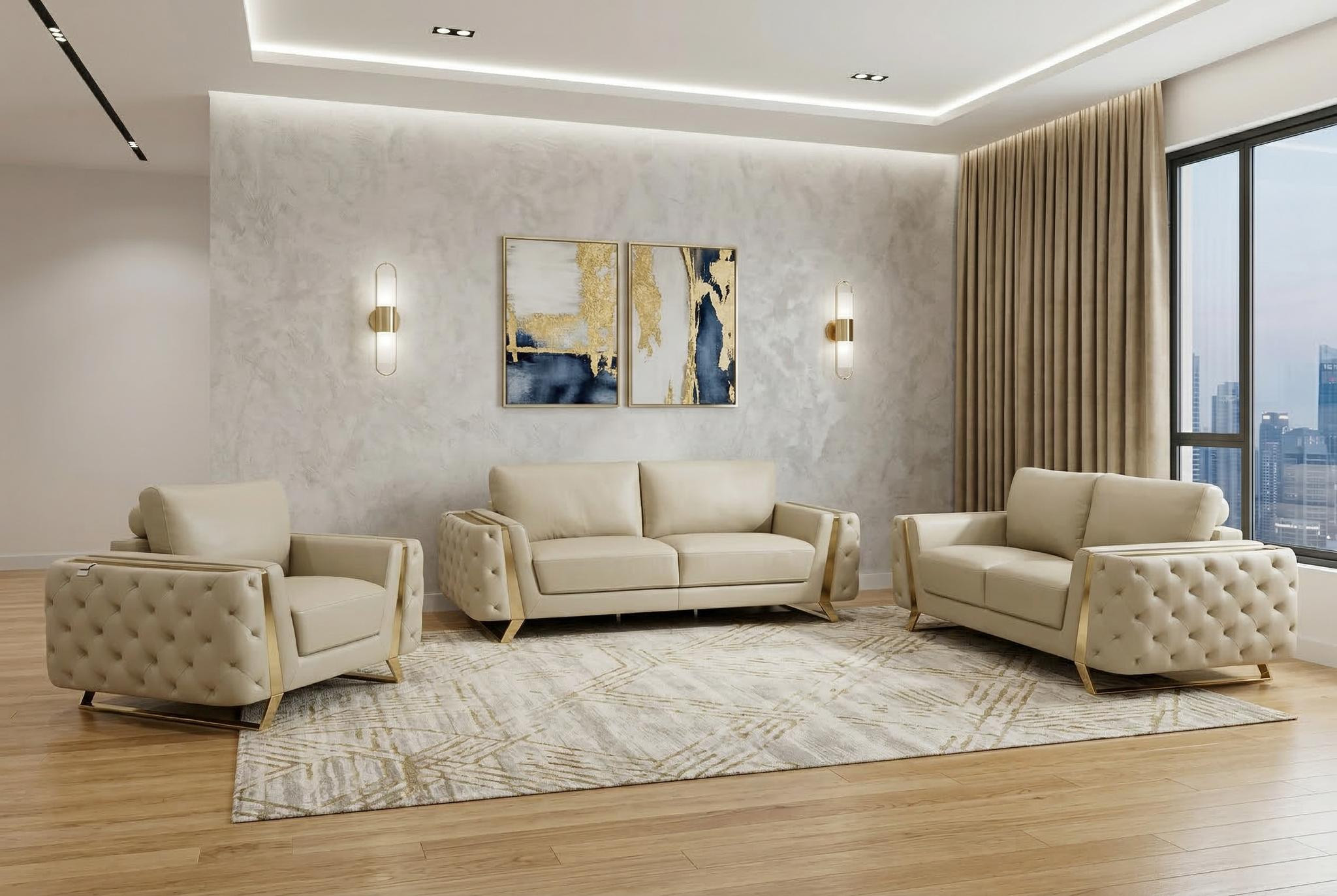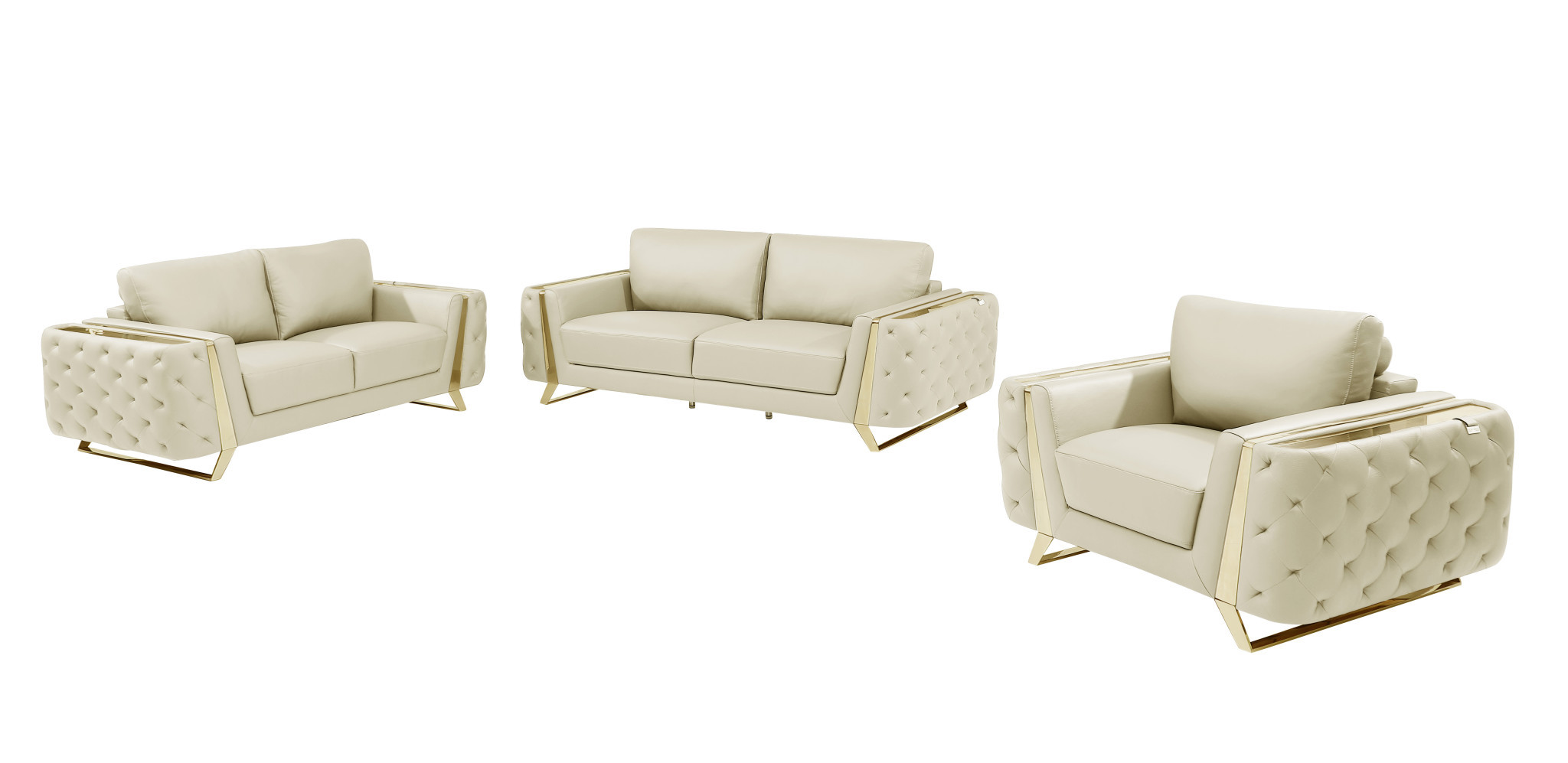 Step into a world of unparalleled seating comfort that is sure to dazzle even the toughest critic with our remarkable three piece indoor beige italian leather six person seating set. Upholstered in supple and luxurious genuine leather, this set has a rich and warm appeal. Coil spring seat construction provides excellent comfort by offering a responsive and supportive seating experience, gently contouring to the body's natural curves. The inclusion of a loveseat into your mix allows a fashionable seating option in a compact design. Chock full of value, this set has it all. 33.5-inch H x 90-inch W x 39-inch D