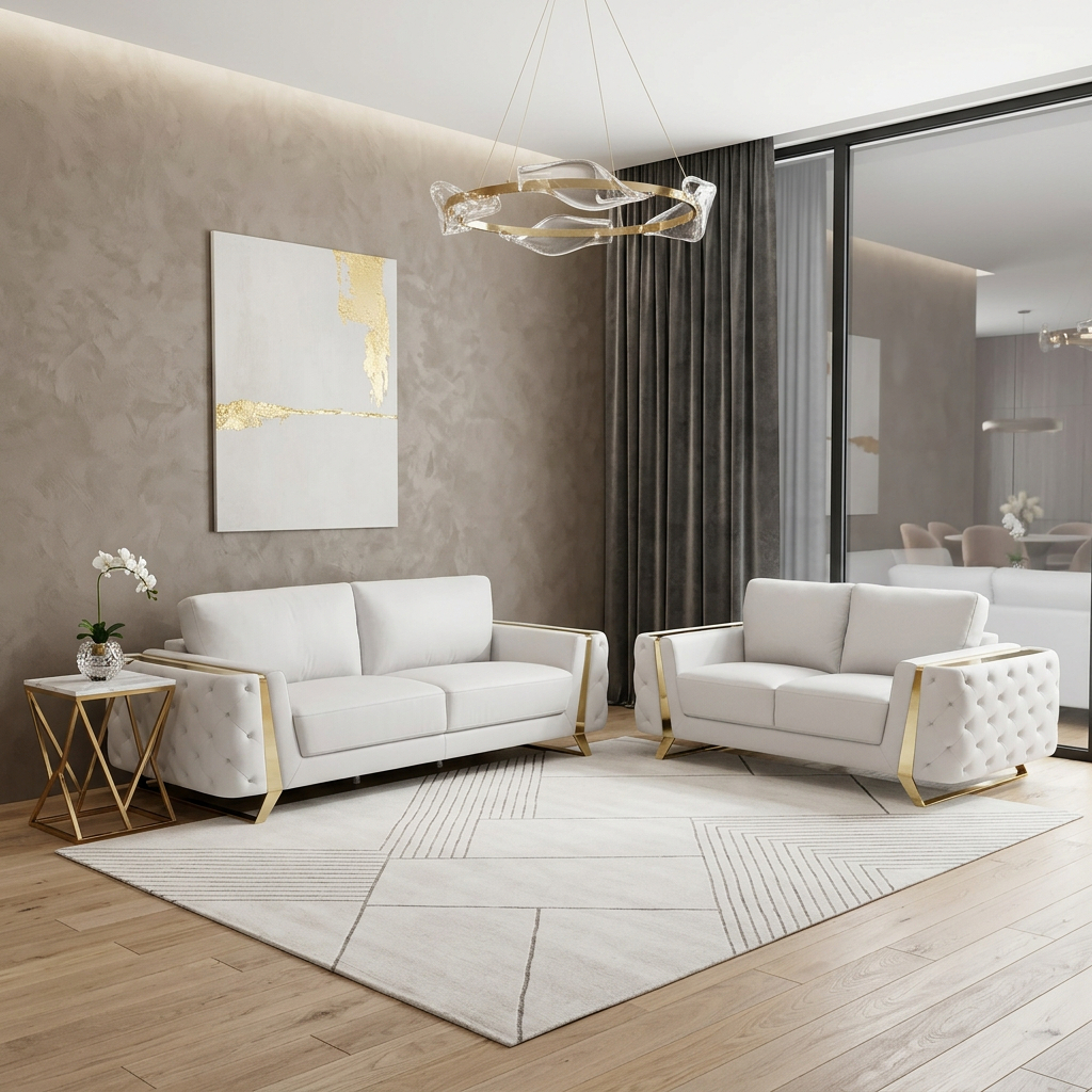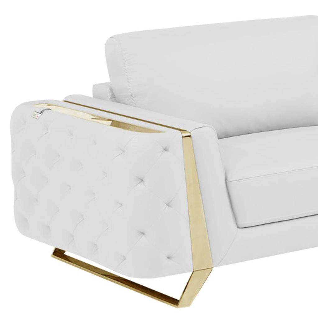 Step into a world of unparalleled seating comfort that is sure to dazzle even the toughest critic with our remarkable two piece indoor white italian leather five person seating set. Upholstered in supple and luxurious genuine leather, this set has a rich and warm appeal. Coil spring seat construction provides excellent comfort by offering a responsive and supportive seating experience, gently contouring to the body's natural curves. The inclusion of a loveseat into your mix allows a fashionable seating option in a compact design. Ready to re-decorate. This set is an obvious choice to fill your space with style and class. 33.5-inch H x 90-inch W x 39-inch D