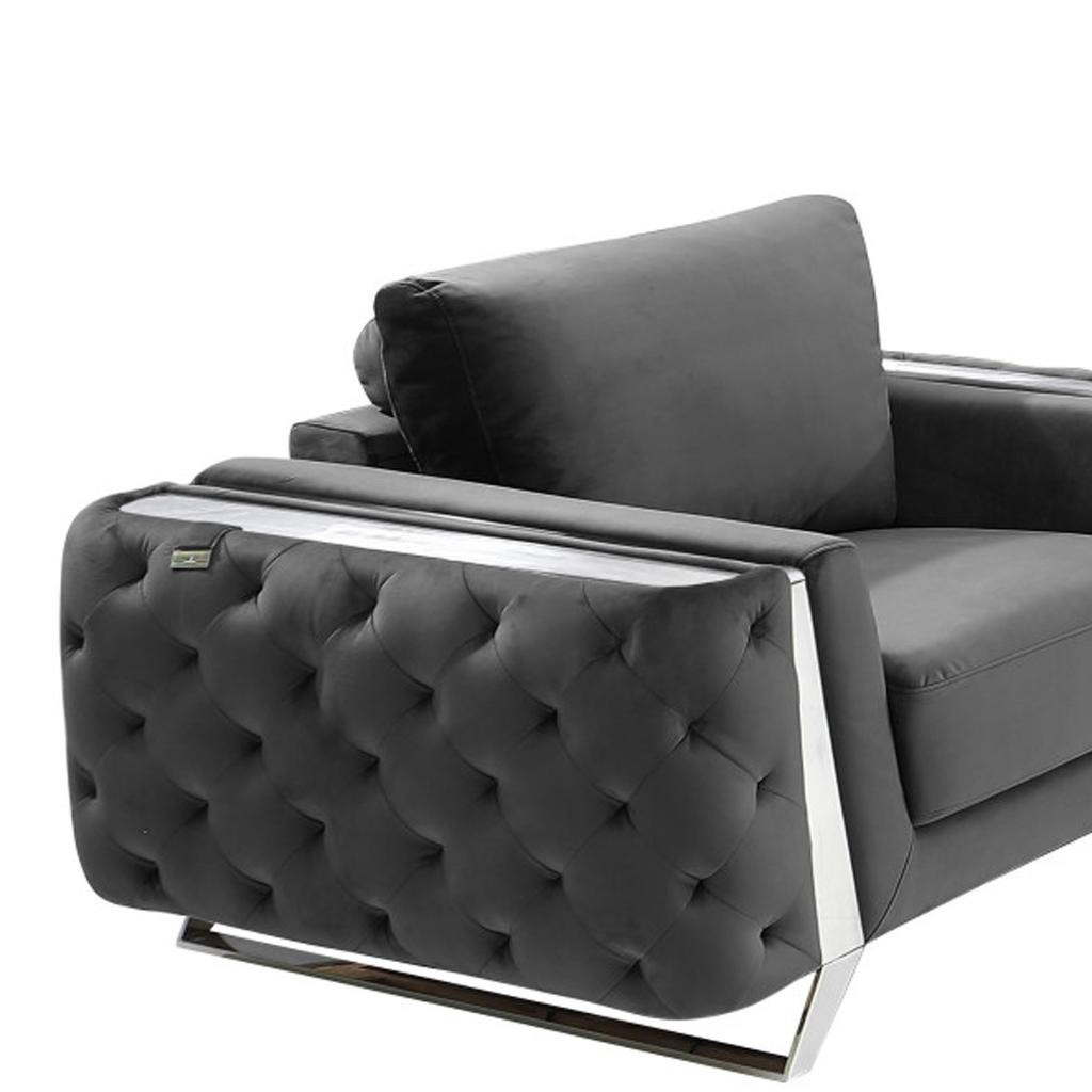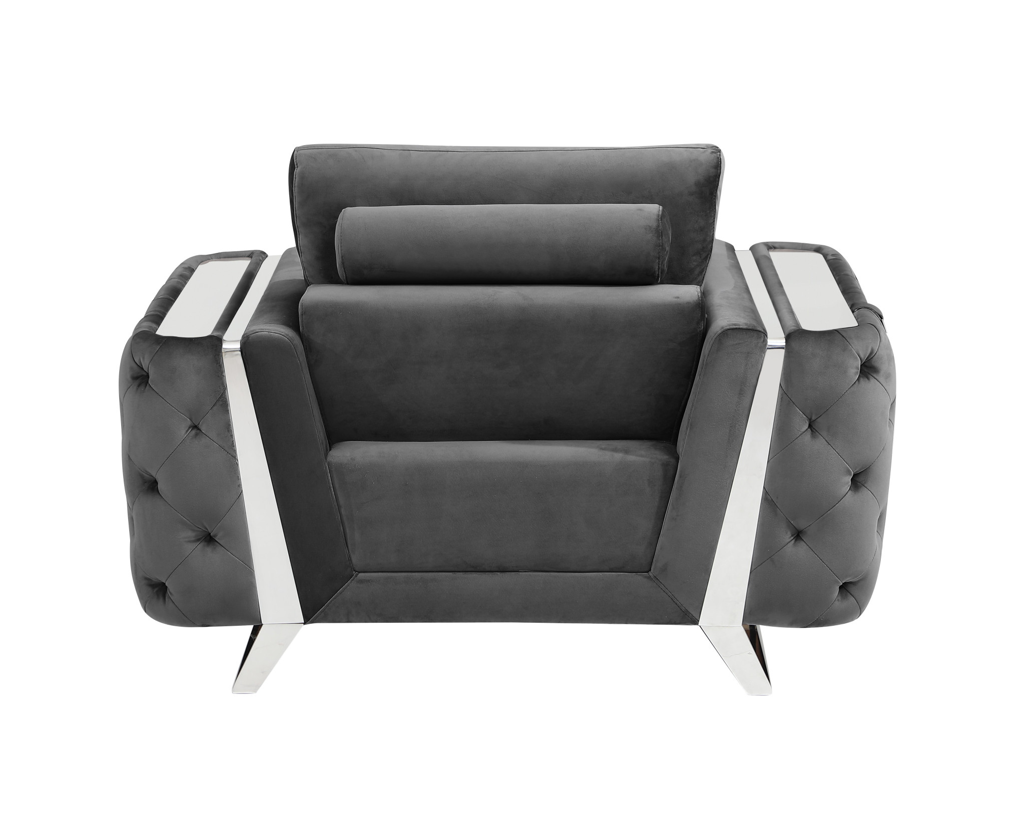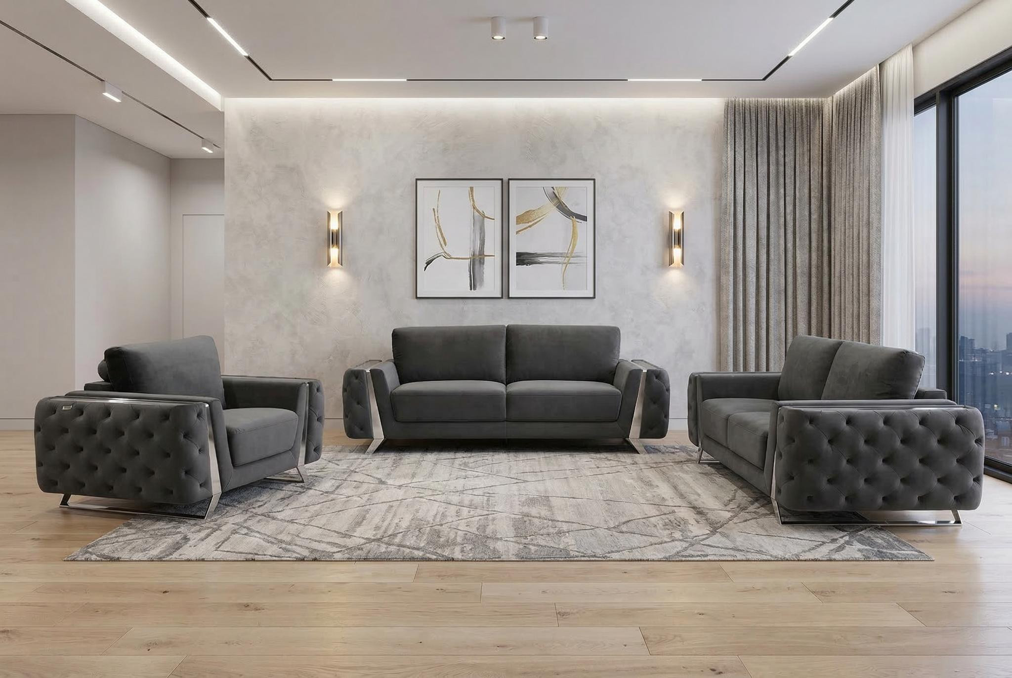 Step into a world of unparalleled seating comfort that is sure to dazzle even the toughest critic with our remarkable three piece indoor dark gray velvet six person seating set. Create a welcoming and inviting ambiance with a seating set featuring velvet that combine resilience, comfort, and timeless elegance, making every seating experience a delight. The presence of coil spring seat construction helps distribute weight evenly, reducing pressure points and enhancing overall comfort by minimizing the strain on specific areas of the body. The inclusion of a loveseat into your mix allows a fashionable seating option in a compact design. Ready to re-decorate. This set is an obvious choice to fill your space with style and class. 33.5-inch H x 90-inch W x 39-inch D