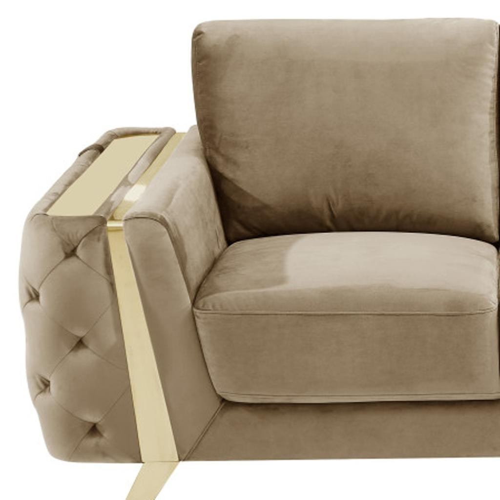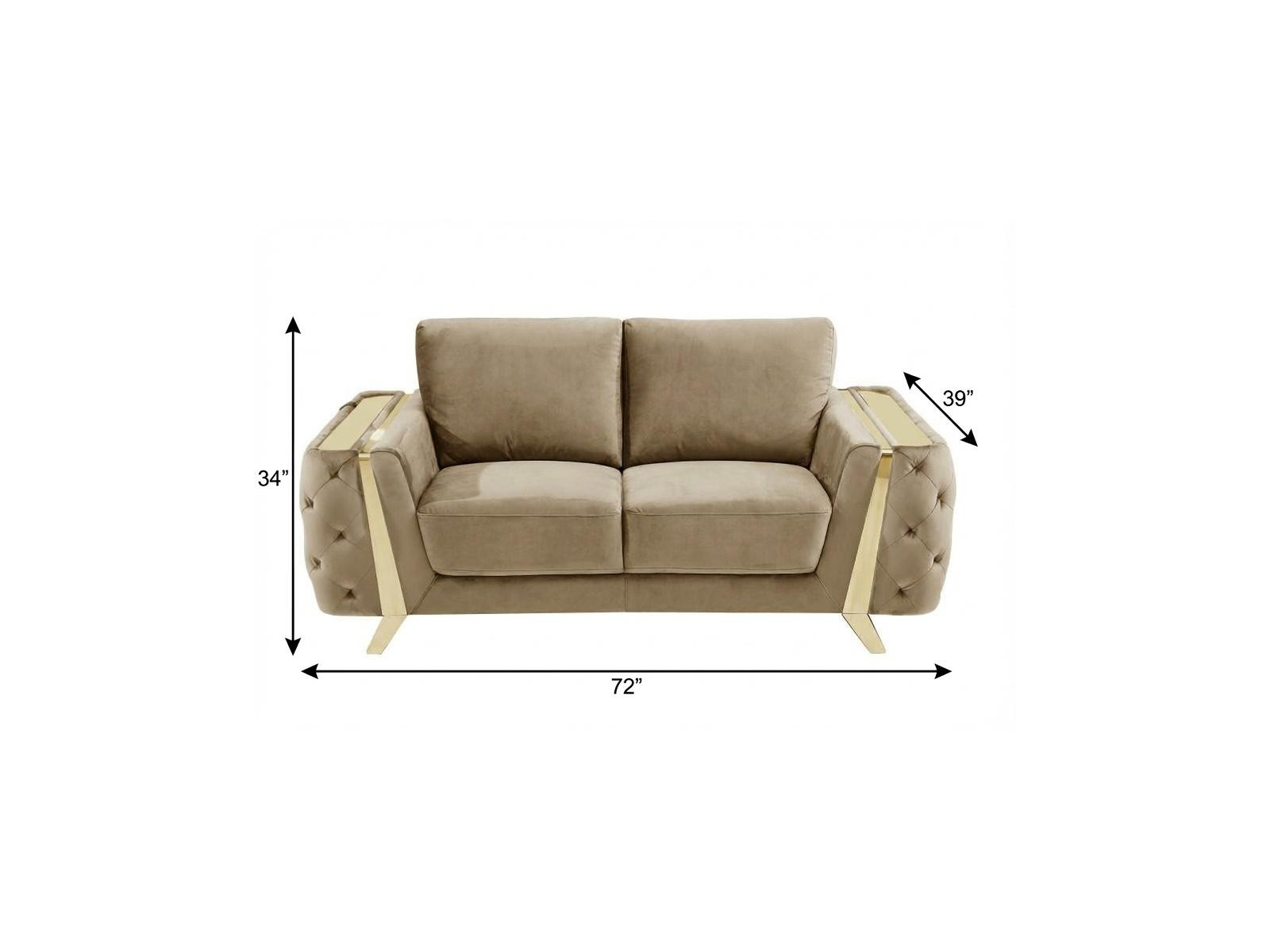 Designed for comfort and good looks, this 72-inch beige and gold velvet love seat is a great option to anchor your space. Pocket spring construction gives this piece strong support and makes it comfortable to sit even for long periods of time. Square arms offer a comfy place to rest and give this piece some interest and shape. Gold metal legs effortlessly elevate the room and add a touch of contemporary design. A great showpiece for your room, this sofa is a must have. 34-inch H x 72-inch W x 39-inch D
