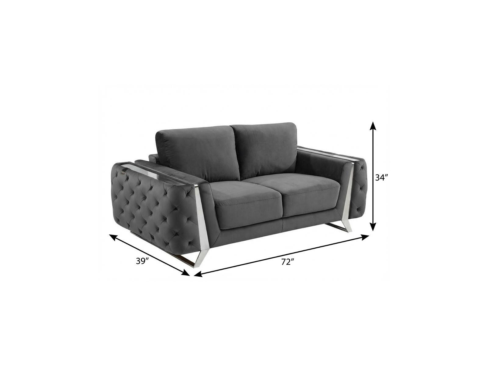Add an air of fashion to your space with this fabulous 72-inch dark gray and silver velvet loveseat. Square arms offer a comfy place to rest and give this piece some interest and shape. Silver metal legs effortlessly elevate the room and add a touch of contemporary design. A great showpiece for your room, this sofa is a must have. 34-inch H x 72-inch W x 39-inch D