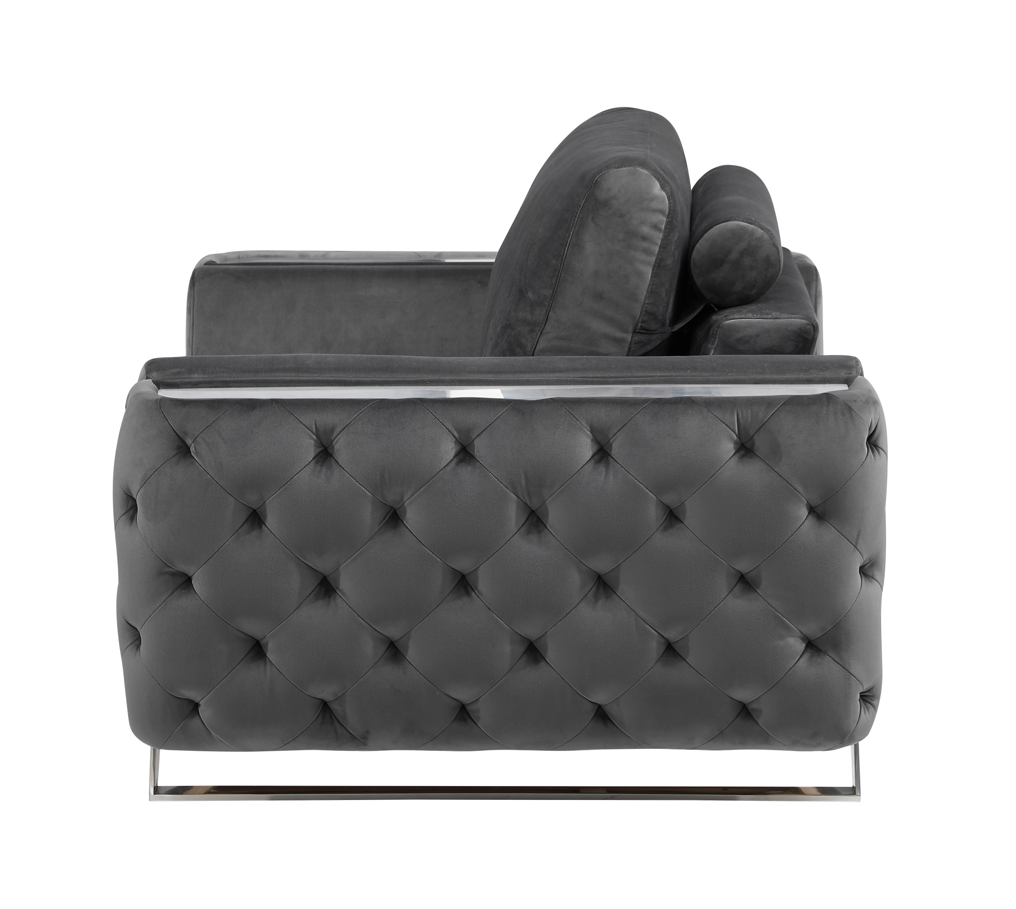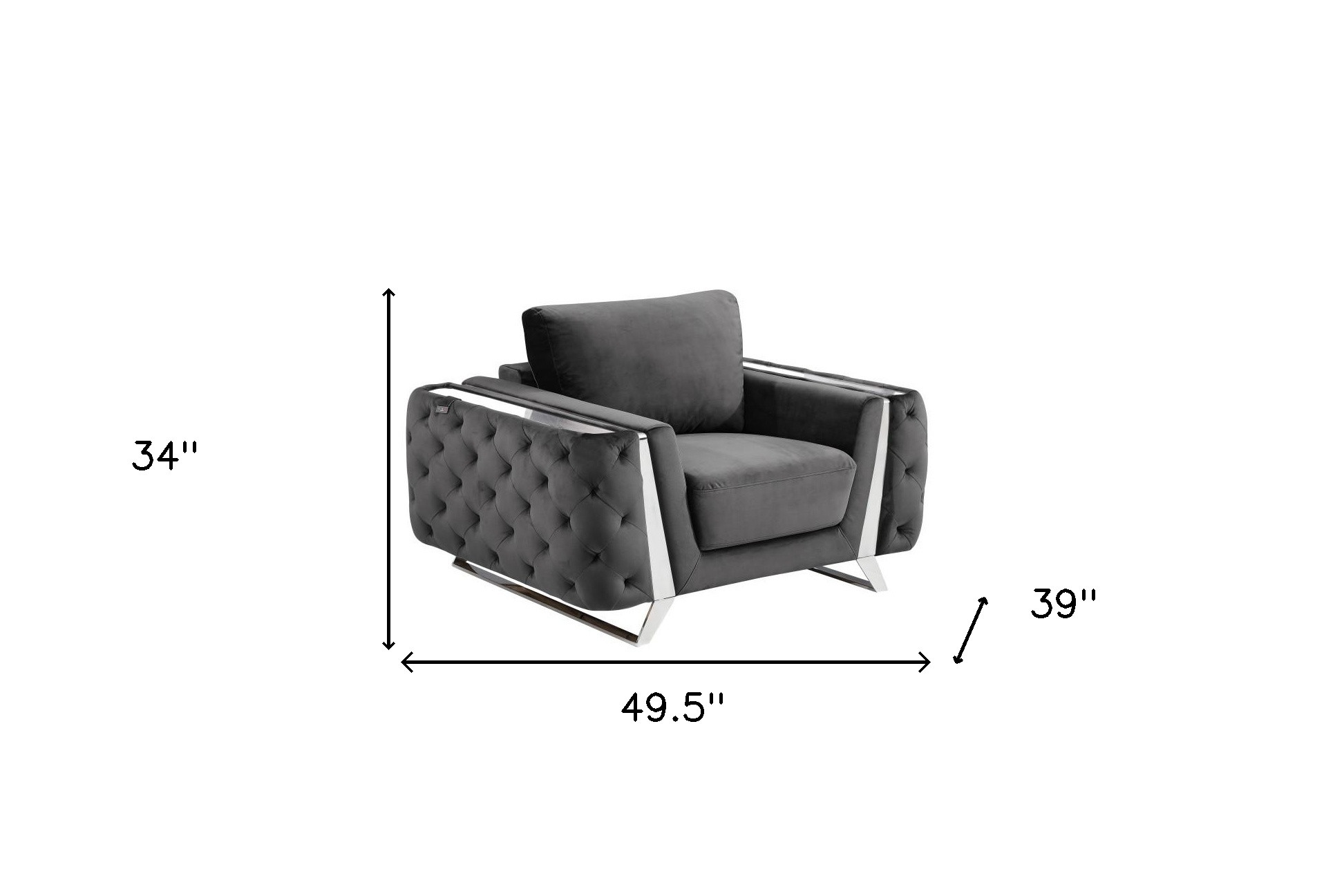 Unique and decorative, this 50-inch dark gray and silver velvet tufted club chair will leave a lasting impression. This sturdy velvet upholstered club chair comes in a chic solid dark gray color to give your space just the right look. Giving the chair stability and structure, the inner frame is constructed with high quality metal, includes comfy armrests, and features a cushion back that comes complete with soft and comfortable cushioning. The tufted cushions add fine designer detailing and are removable for convenience. 34-inch h x 49.5-inch w x 39-inch d.