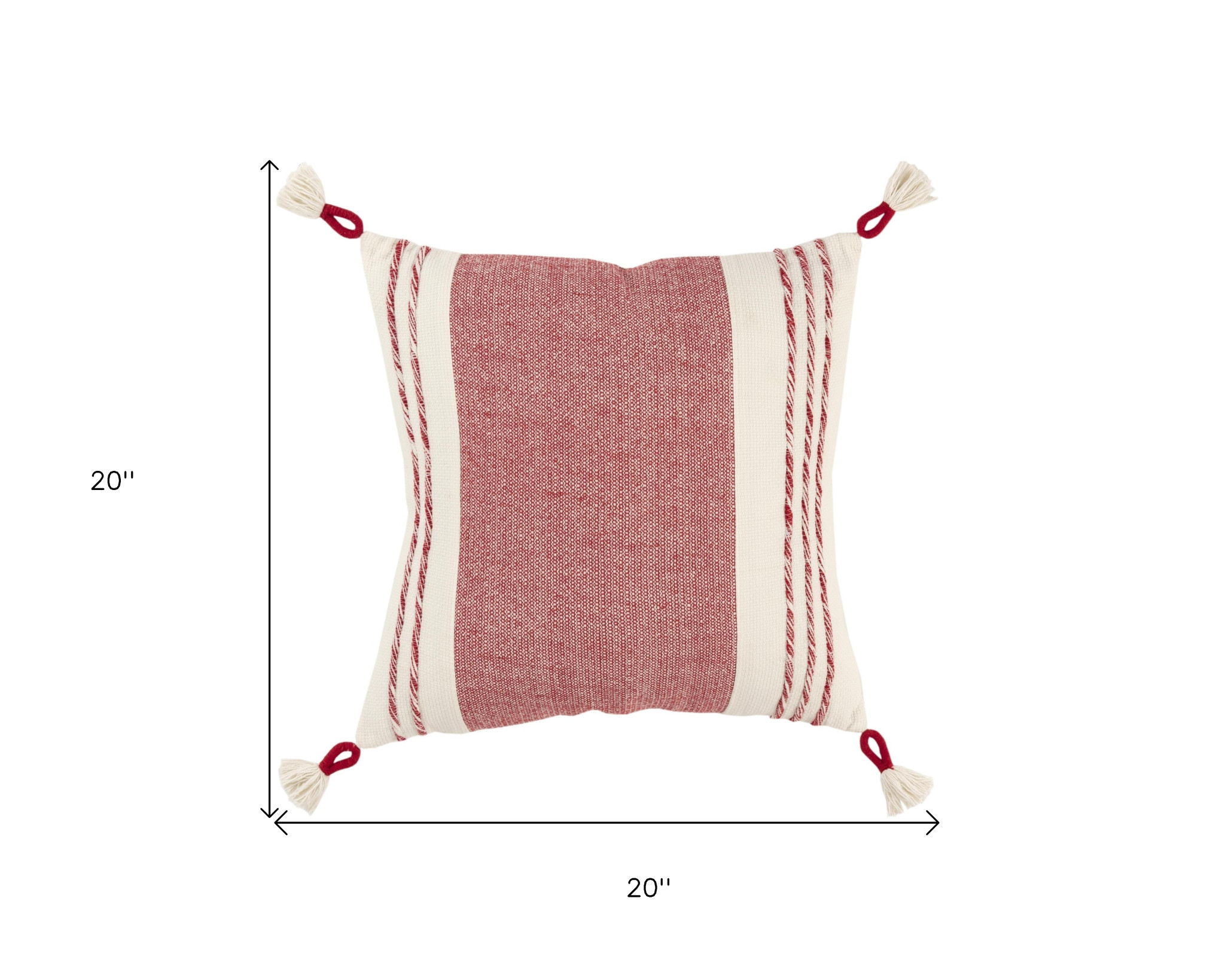 The perfect complement to your sofa, favorite chair, or bed, this 20-inch red and white color block cotton throw pillow with tassels is a great decorative accent. This soft and durable decorative pillow is expertly made of high grade, long lasting cotton in a red and white coloration. Charming decorative tassels give this design texture along with a hand-crafted look and feel. This soft polyester filled pillow not only is decorative but made to be comfy and cozy all day long. Great to use on its own or mix with other decorations for the perfect look. Decorative pillows are a great way to change up the look and feel of your space easily and quickly. 20-inch H x 20-inch W x 6.25-inch D