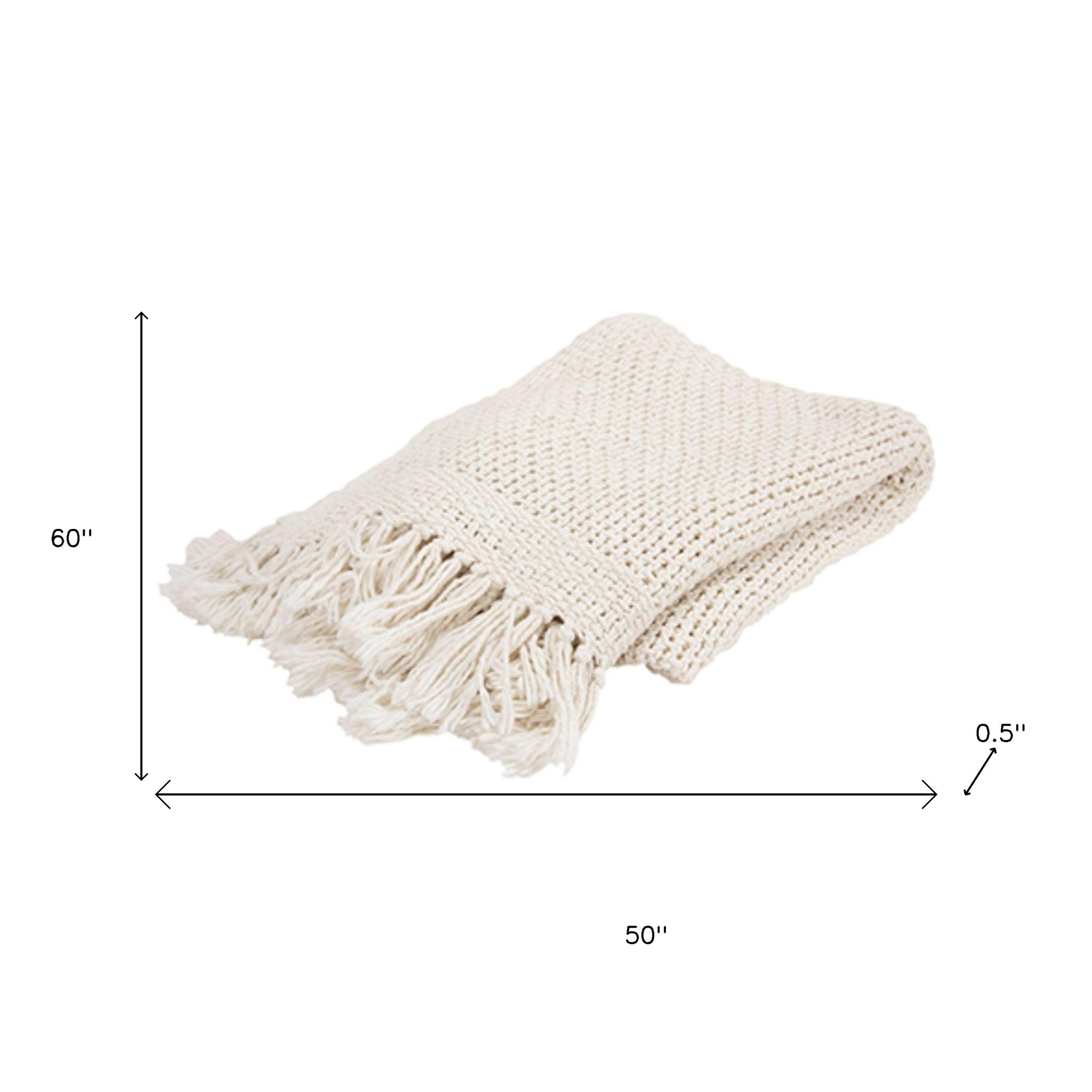 This 50-inch x 60-inch white cotton knitted throw blanket with fringe is the perfect accent you've been searching for. Featuring hand knotted fringe, this good looking open weave net-like throw blanket will elevate its surroundings with its genuine and artisanal style. Hot cocoa tastes better with a cozy blanket. This textural knitted offering is the perfect pick those cozy winter nights in. Made from cotton this blanket will make a great addition to any room it's added to. Perfect for your favorite chair, bed or lounging on the couch, this blanket helps bring a warm and fashionable flair to your space. 60-inch h x 50-inch w x 0.5-inch d.