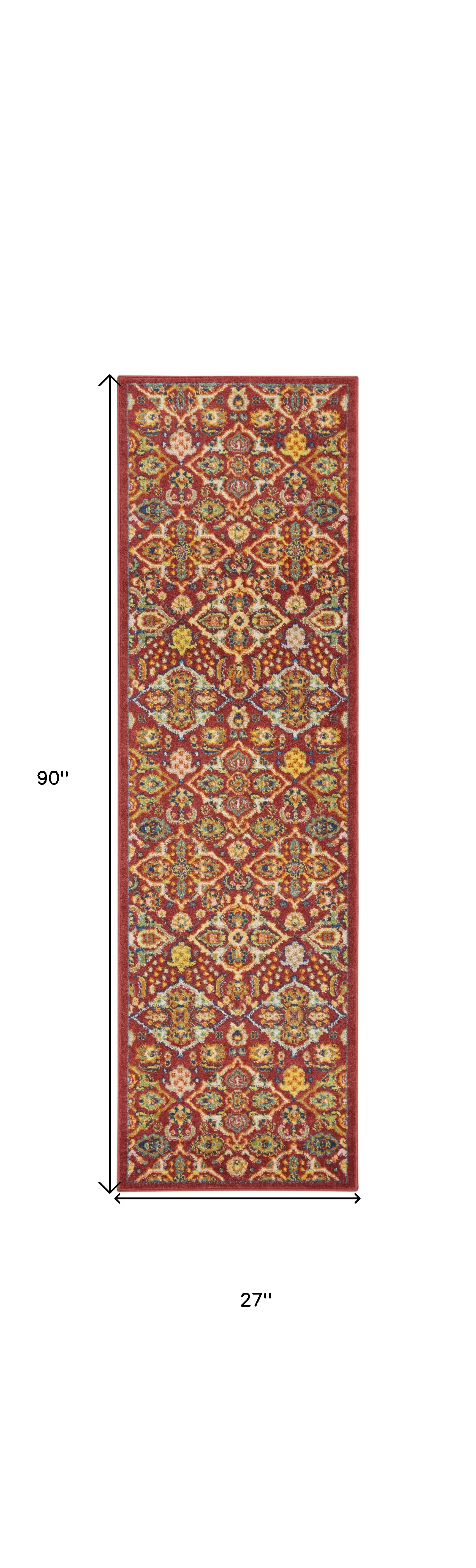 Set an inviting tone in your space with this 8' red floral power loom runner rug. This runner shaped rug features a floral design in red to give it visual interest. A classic shape marries with good looking design for your space This superior Turkish rug represents the highest quality and is built to last. Place this area rug against a hardwood or tile floor and it will enliven your living space with style and sophistication. .25" H x 27.00" W x 90.00" D