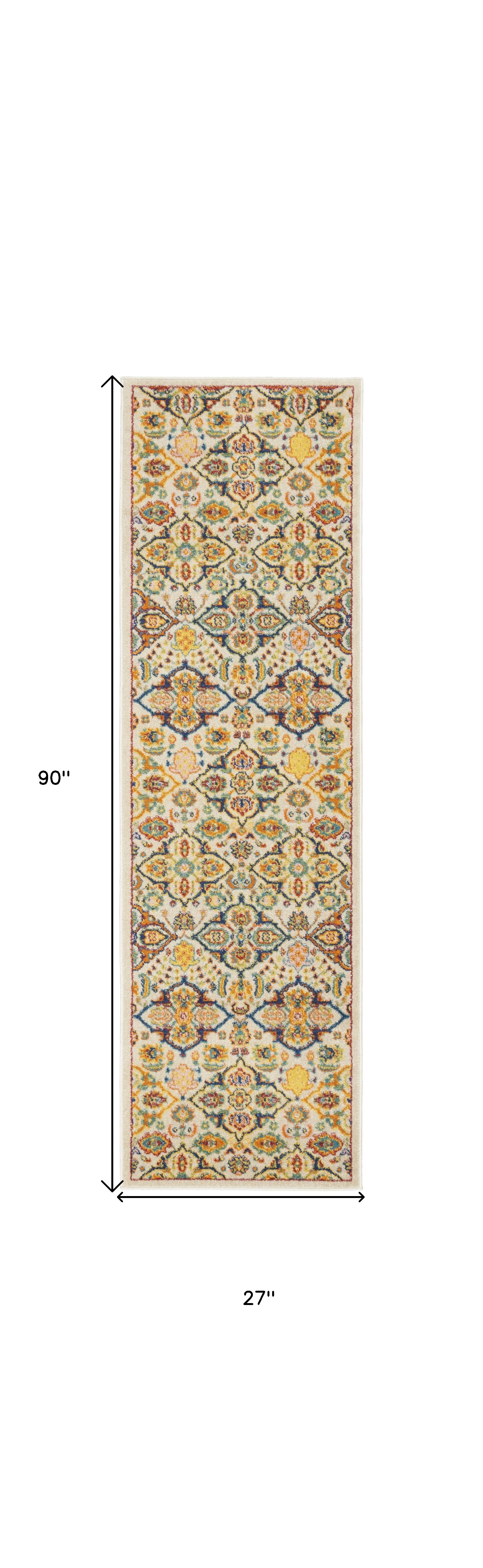 This 8' ivory floral power loom runner rug, is a great way to add warmth to a room. This runner shaped rug features a floral design in ivory to give it visual interest. A classic shape marries with good looking design for your space This superior Turkish rug represents the highest quality and is built to last. Area Rugs help to give warmth and sense of home to your space. .25" H x 27.00" W x 90.00" D