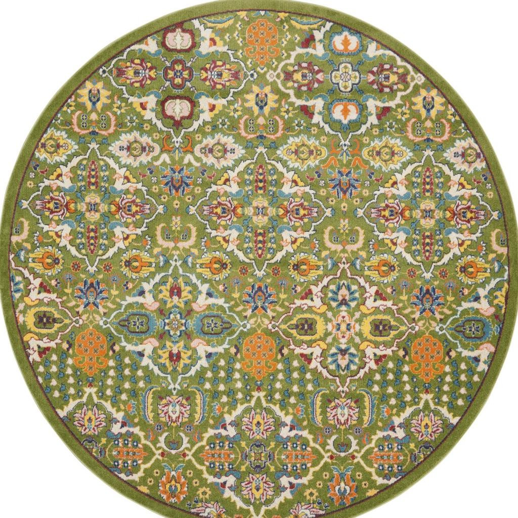Set an inviting tone in your space with this 8' green round floral power loom area rug. This geometric round shaped rug features a floral pattern in green that combines a good looking print with a unique and updated shape. The mix of shape, color, and design gives this rug refreshing visual interest. Made in Turkey, this rug offers high quality combined with good looking designer sensibilities. Place this area rug against a hardwood or tile floor and it will enliven your living space with style and sophistication. 0.25" H x 94" W x 94" D