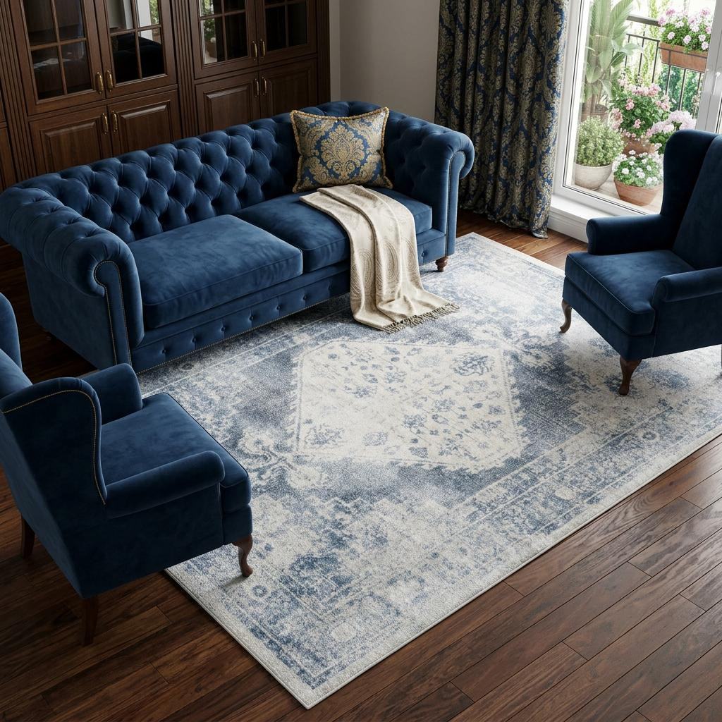 This 7' x 9' blue oriental power loom distressed washable area rug, is a great way to add warmth to a room. This rectangle shaped rug features a oriental design in blue to give it visual interest. A classic shape marries with good looking design for your space This superior Turkish rug represents the highest quality and is built to last. Area Rugs help to give warmth and sense of home to your space. .25" H x 79.00" W x 108.00" D