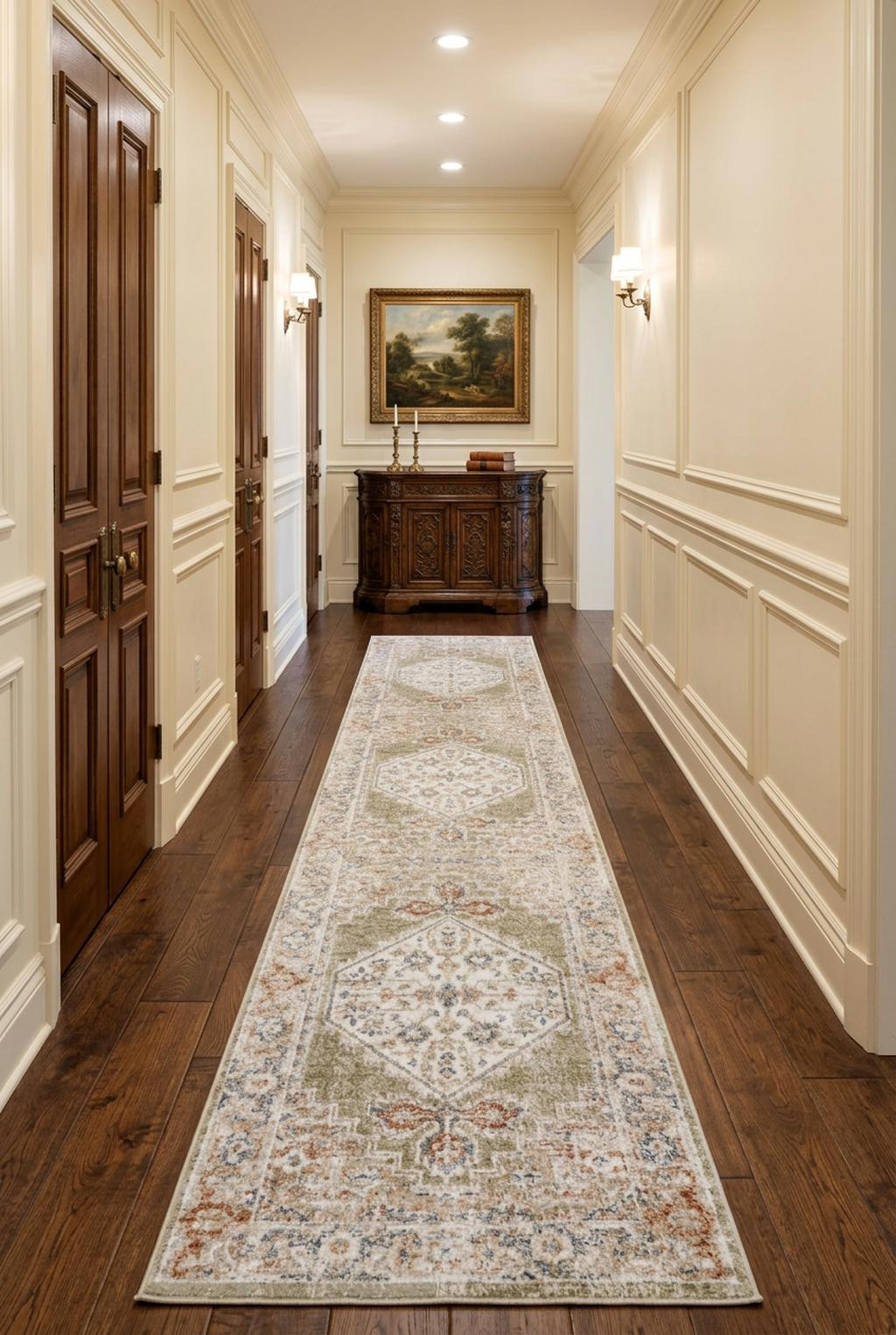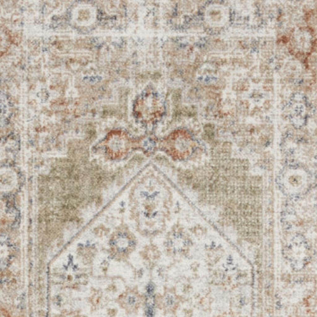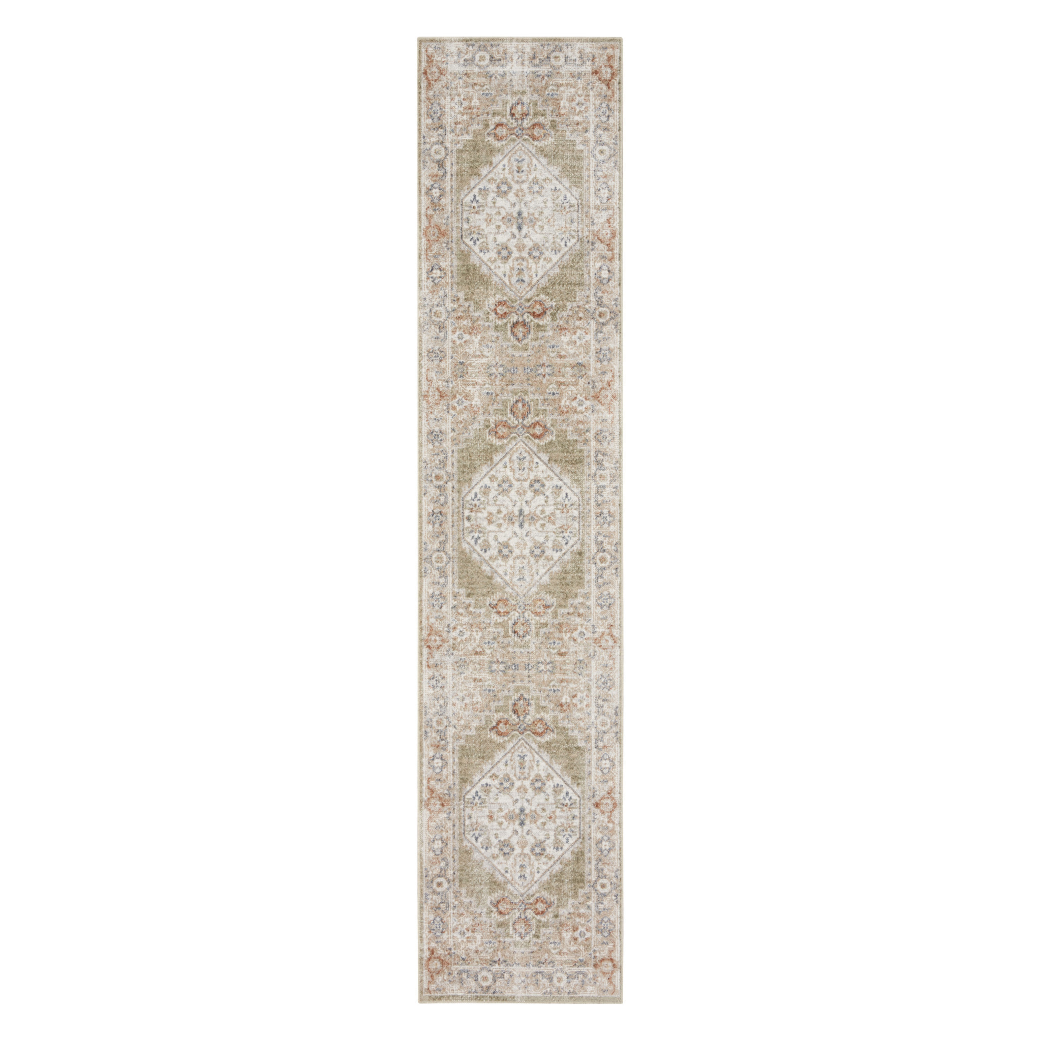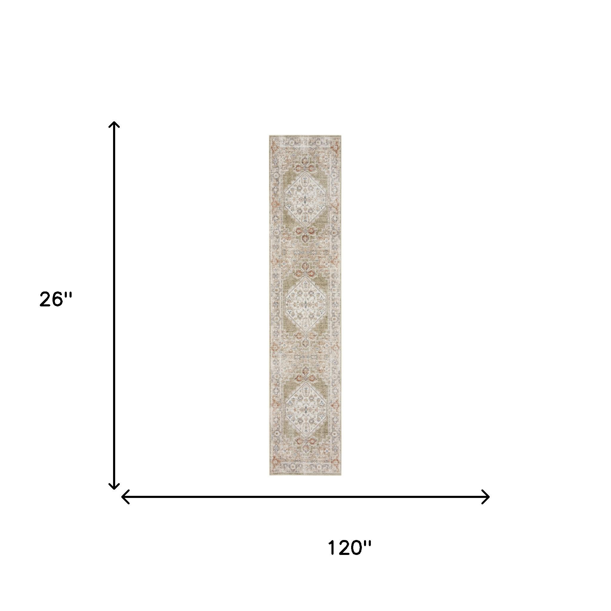 Add great coloration and comfortable texture to your space with this 10' sage oriental power loom distressed washable runner rug. This runner shaped rug features a oriental design in sage to give it visual interest. A classic shape marries with good looking design for your space This superior Turkish rug represents the highest quality and is built to last. Place this area rug against a hardwood or tile floor and it will enliven your living space with style and sophistication. .25" H x 26.00" W x 120.00" D