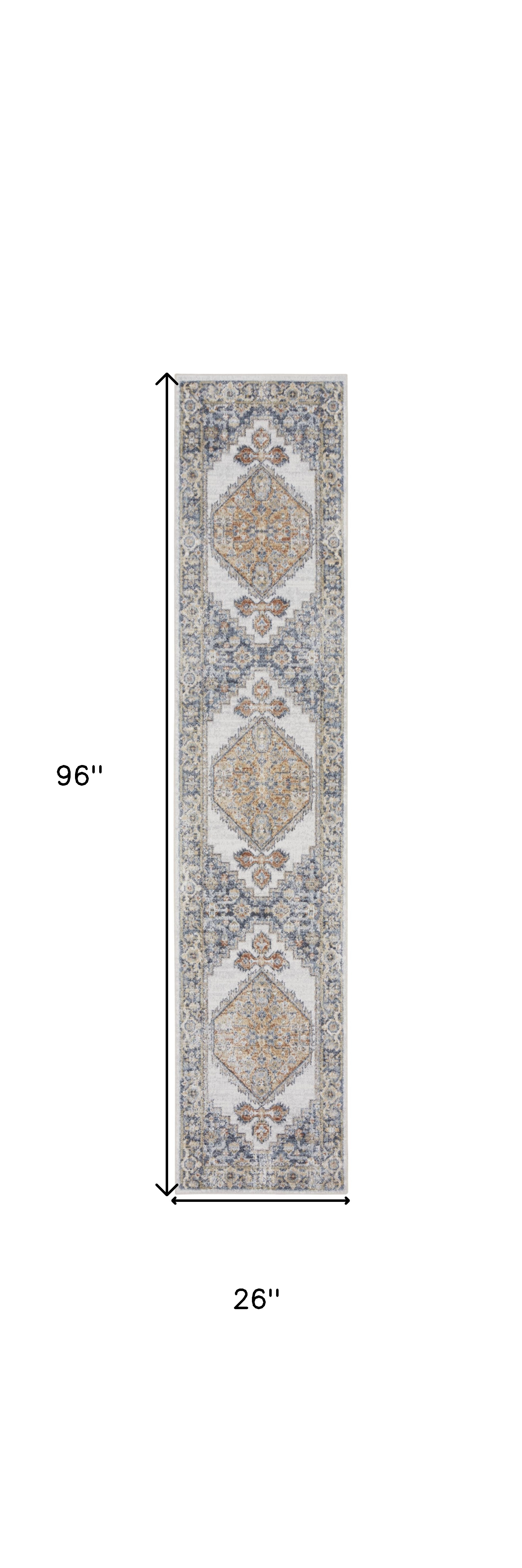 This 8-foot gray and gold floral medallion distressed washable runner rug, is a great way to add warmth to a room. Built to last, this rug crafted from polyester fibers is known for its durability and long lasting appeal. Rugs are a great way to showcase your style, hide imperfections, warm your home and reduce noise. This transitional style runner makes a great accent for the hallway, in front of cabinets, in the laundry room, or any other space you need a narrow and long rug. 26.00-inch h x 96.00-inch w x 0.25-inch d.