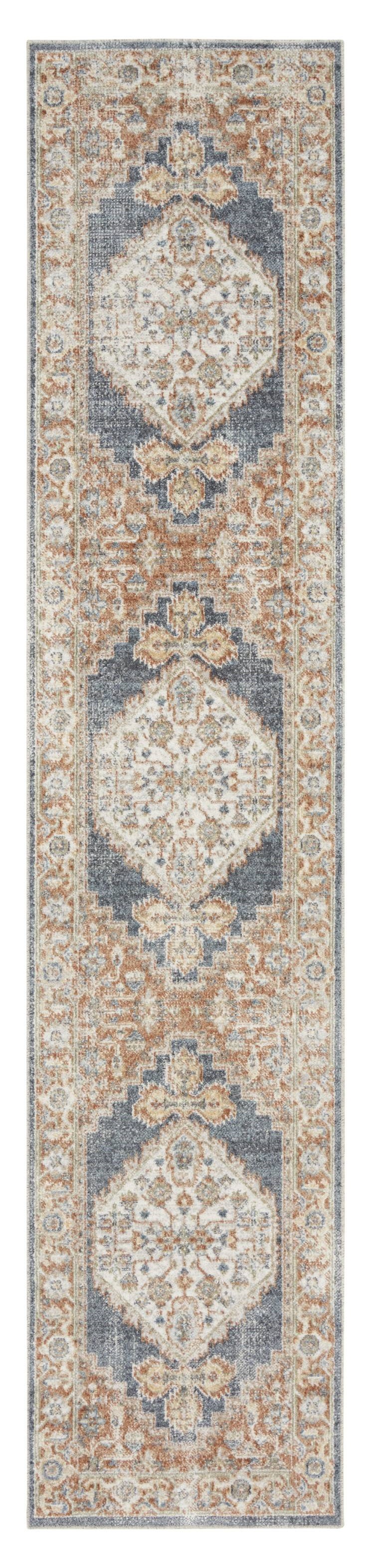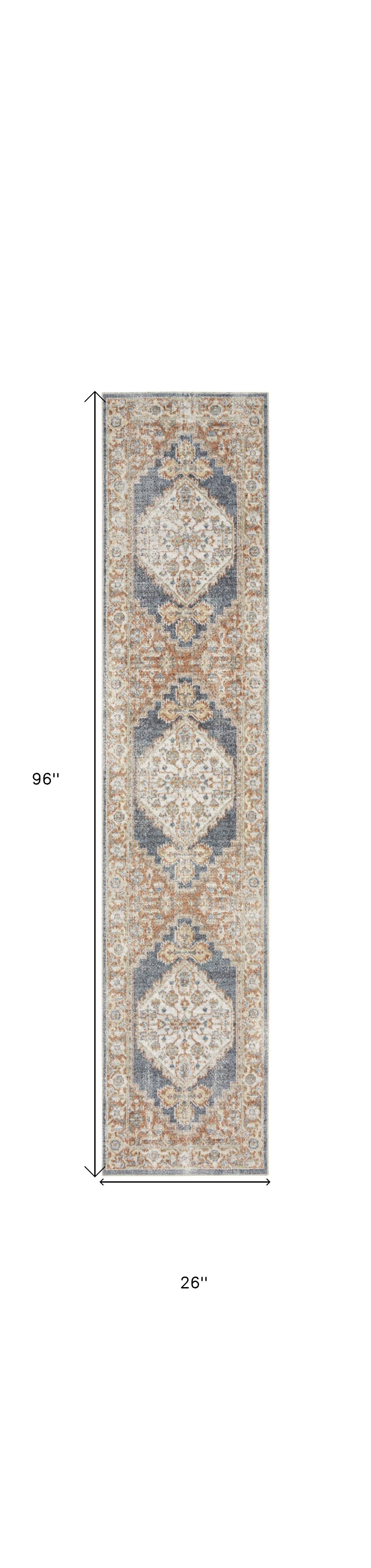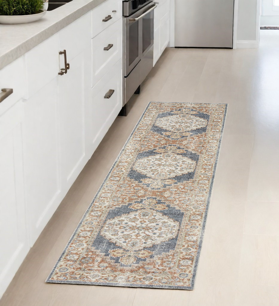 Set an inviting tone in your space with this 8-foot denim blue oriental power loom distressed washable runner rug. This runner shaped rug features a oriental design that will add a functional and decorative accent to your space. This smaller sized rug is just what you need for your walkway, or in front of door, cabinet, refrigerator, or chair. 26-inch h x 96-inch w x 0.25-inch d