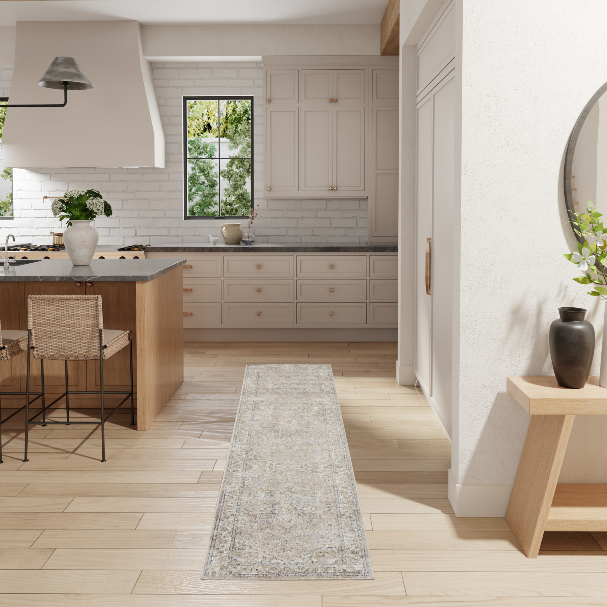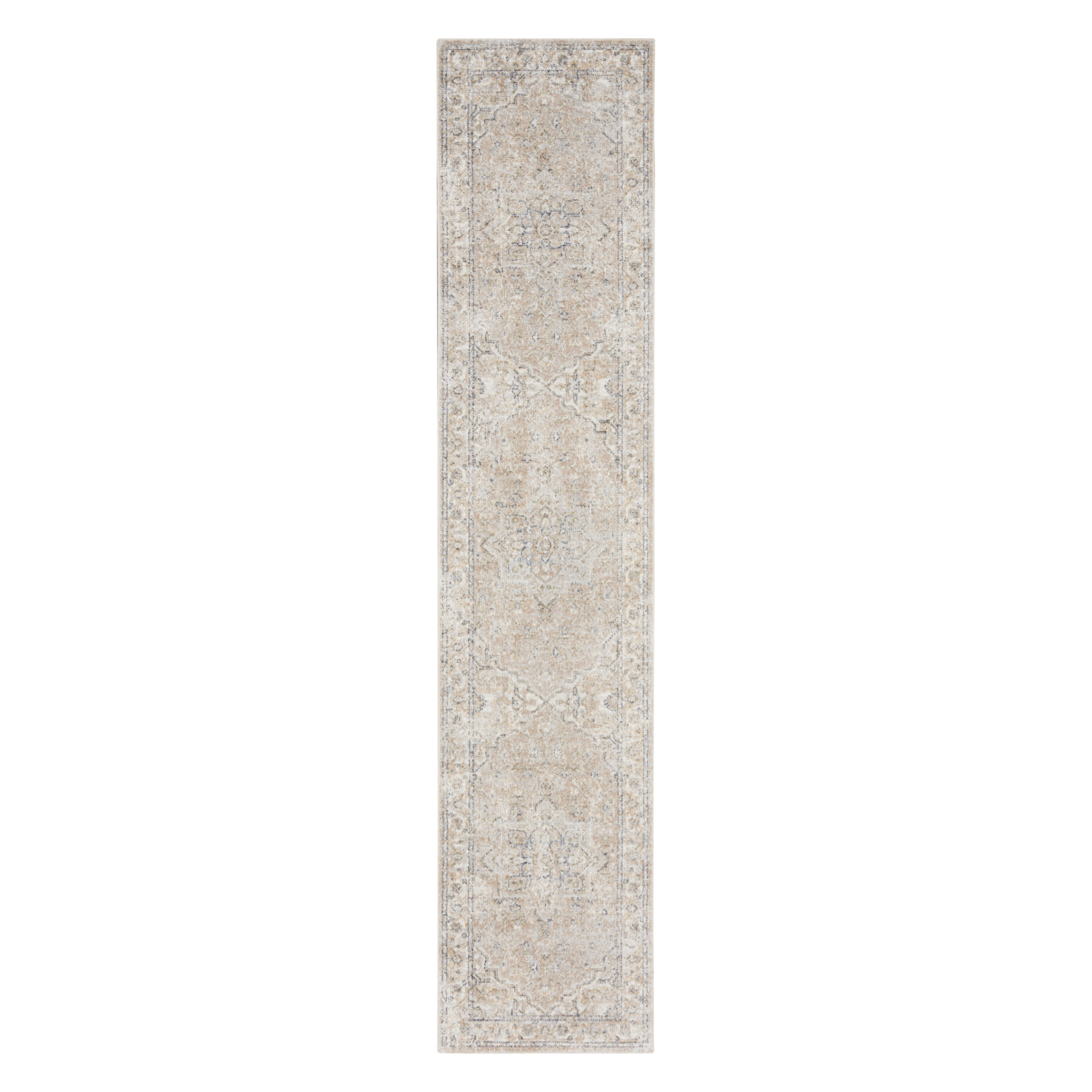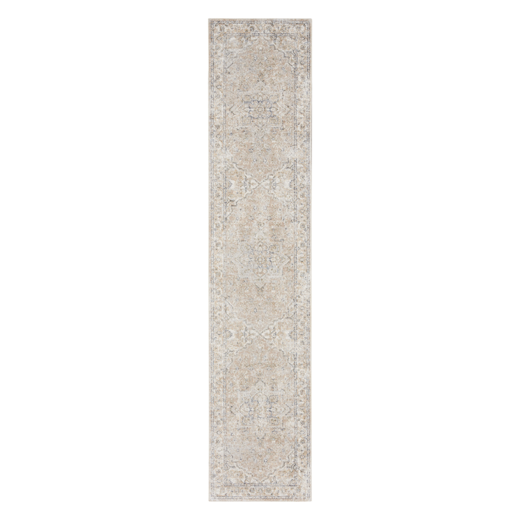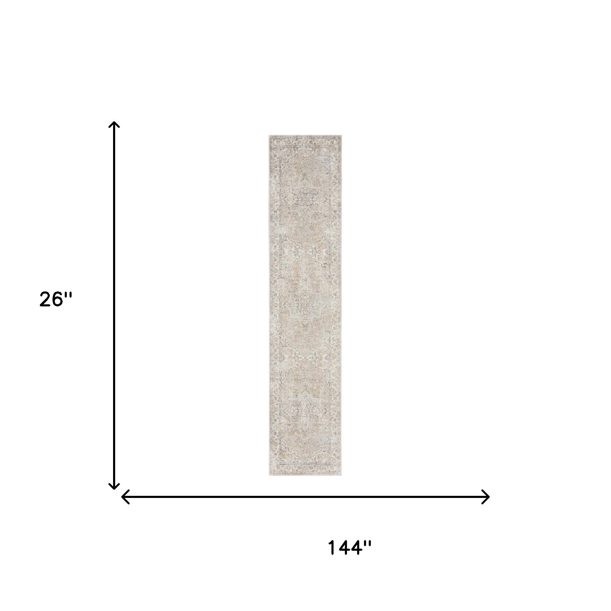 Add some artistry to your room with this 12' beige oriental power loom washable runner rug. This runner shaped rug features a oriental design in beige to give it visual interest. A classic shape marries with good looking design for your space This superior Turkish rug represents the highest quality and is built to last. Place this area rug against a hardwood or tile floor and it will enliven your living space with style and sophistication. .25" H x 26.00" W x 144.00" D