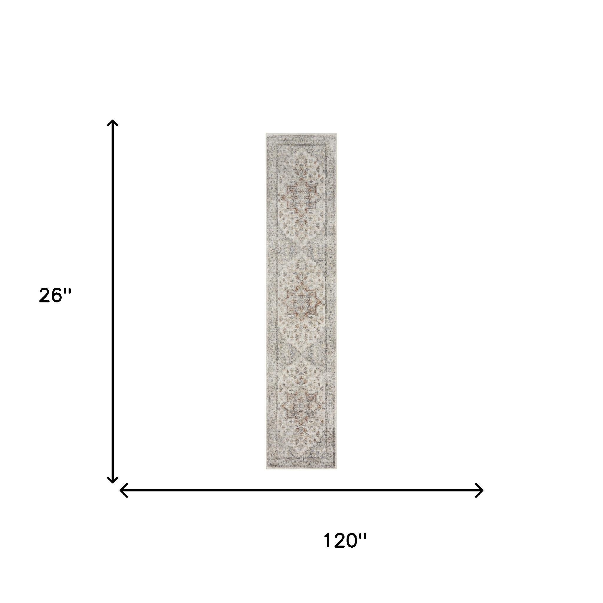 Add great coloration and comfortable texture to your space with this 10' gray oriental power loom washable runner rug. This runner shaped rug features a oriental design in gray to give it visual interest. A classic shape marries with good looking design for your space This superior Turkish rug represents the highest quality and is built to last. Place this area rug against a hardwood or tile floor and it will enliven your living space with style and sophistication. .25" H x 26.00" W x 120.00" D