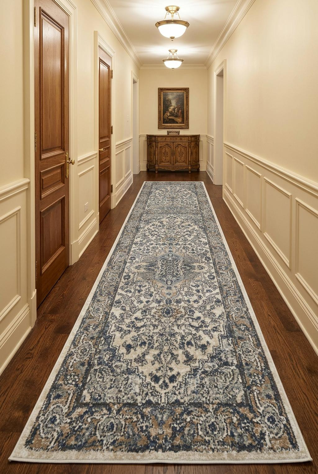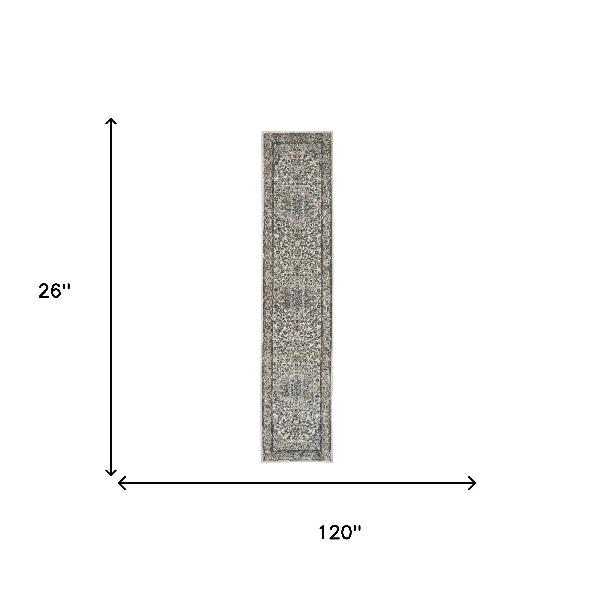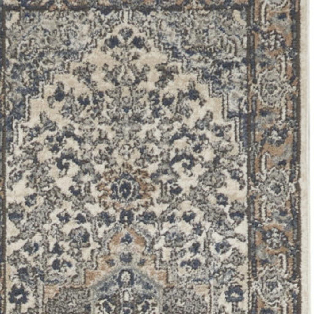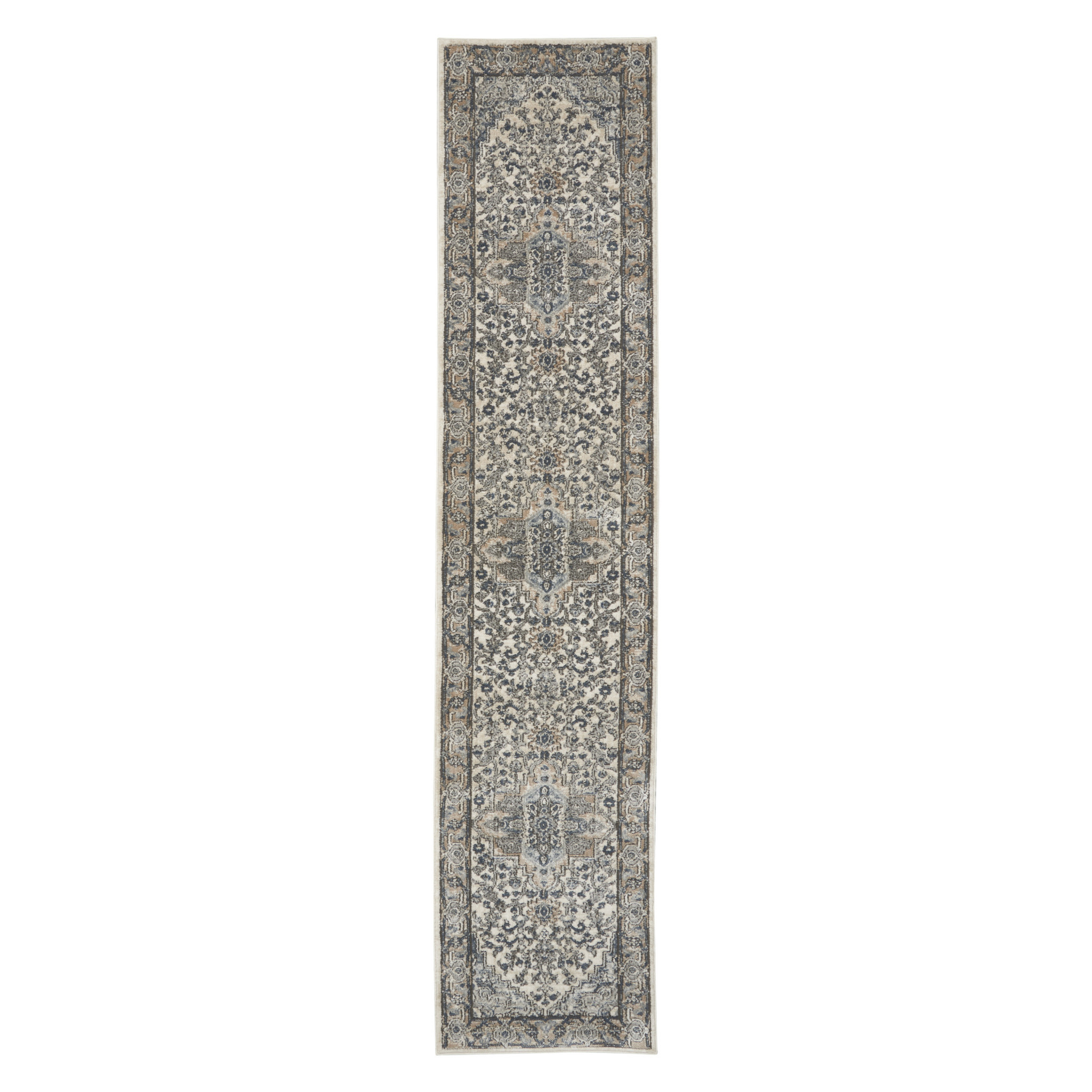 Set an inviting tone in your space with this 10-foot gray and ivory medallion power loom runner rug. This runner shaped rug features a medallion design in gray and ivory to give it visual interest. A classic shape marries with good looking design for your space area rugs help to give warmth and sense of home to your space. 0.32-inch H x 26-inch W x 120-inch D